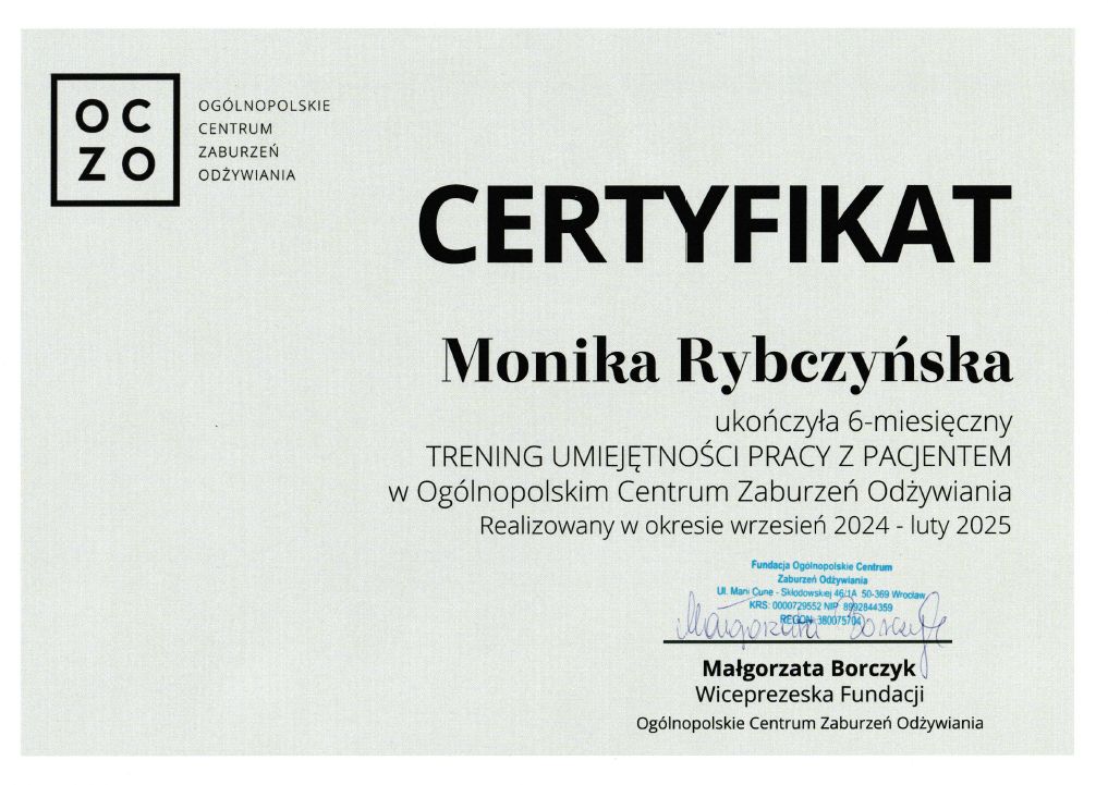 Pani Monika Rybczyńska jest bardzo dorbrą ciepłą osobą dała mi dużo wsparcia już na pierwszym spotkaniu czułam się dużo lepiej