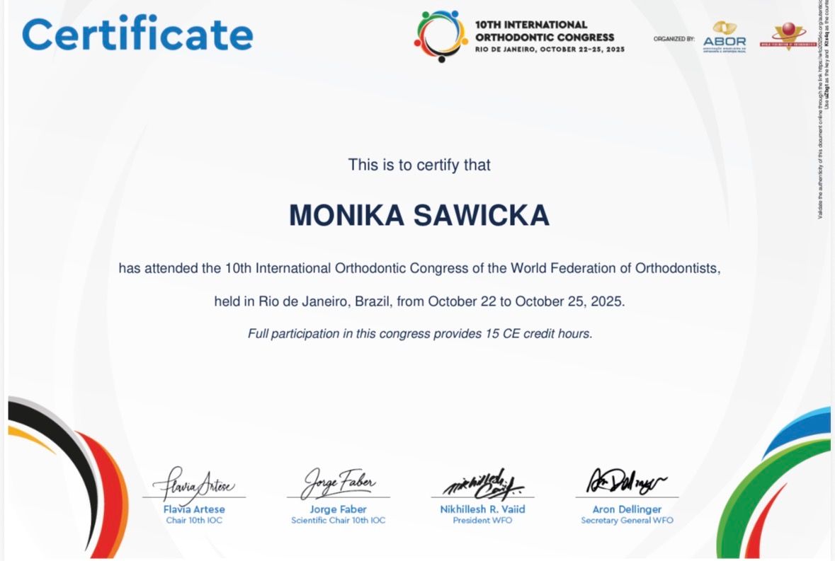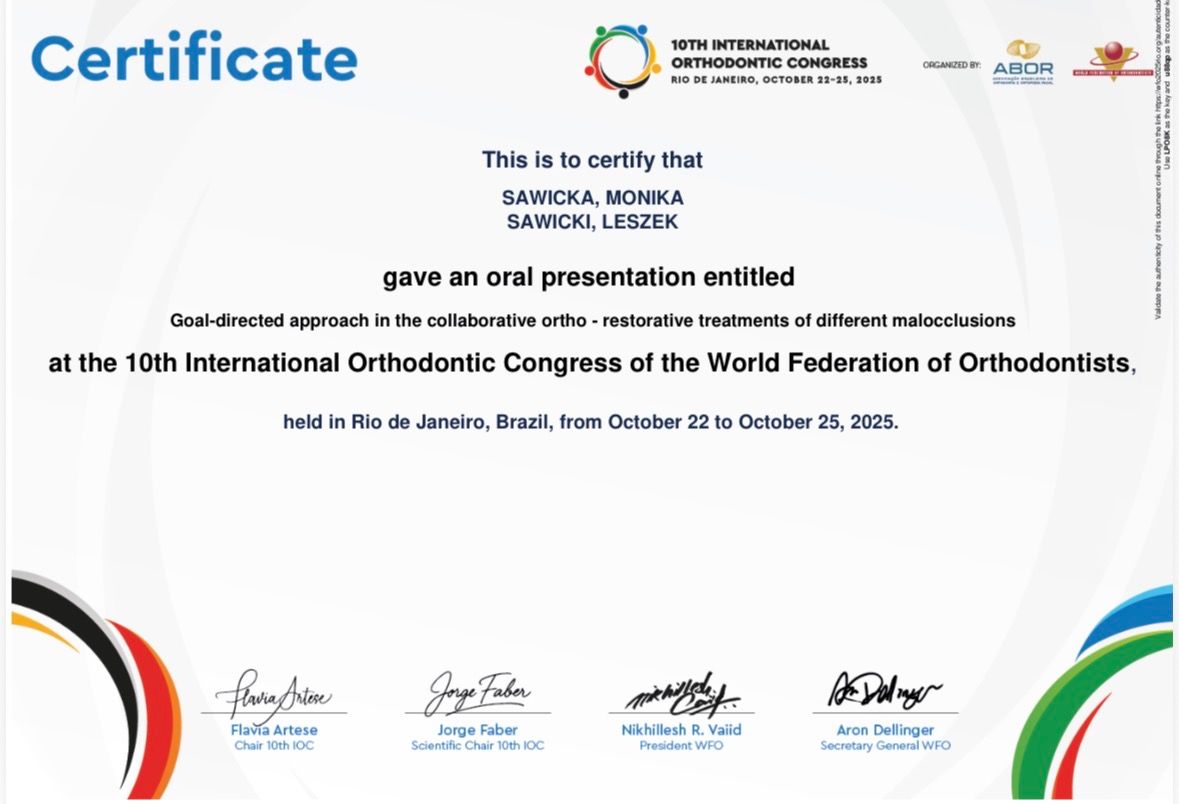 W 2025 roku moje leczenie techniką alignerową zdobyło pierwsze miejsce w ogólnopolskim konkursie na najlepiej przeprowadzony przypadek. W pracy kieruję się zasadą, że skuteczna ortodoncja to nie tylko proste zęby, ale przede wszystkim harmonia, zdrowie i komfort pacjenta.
