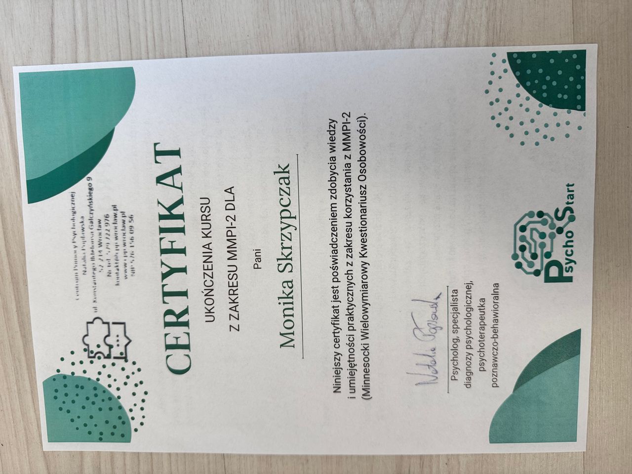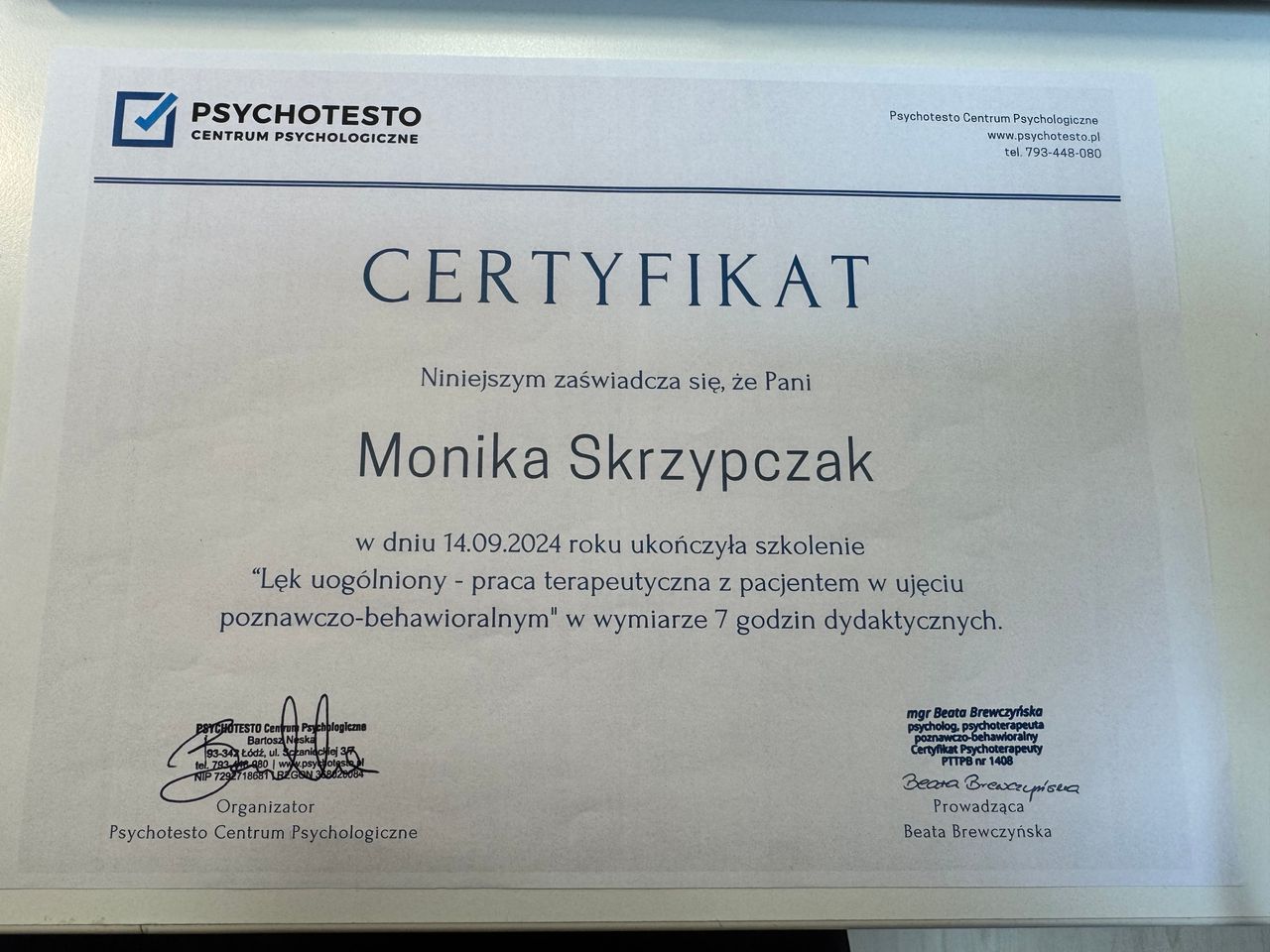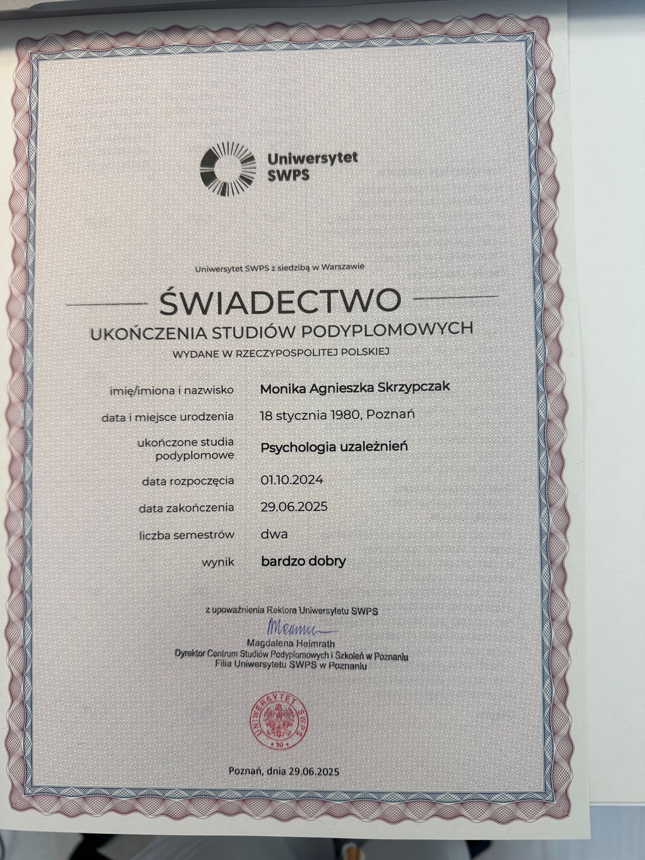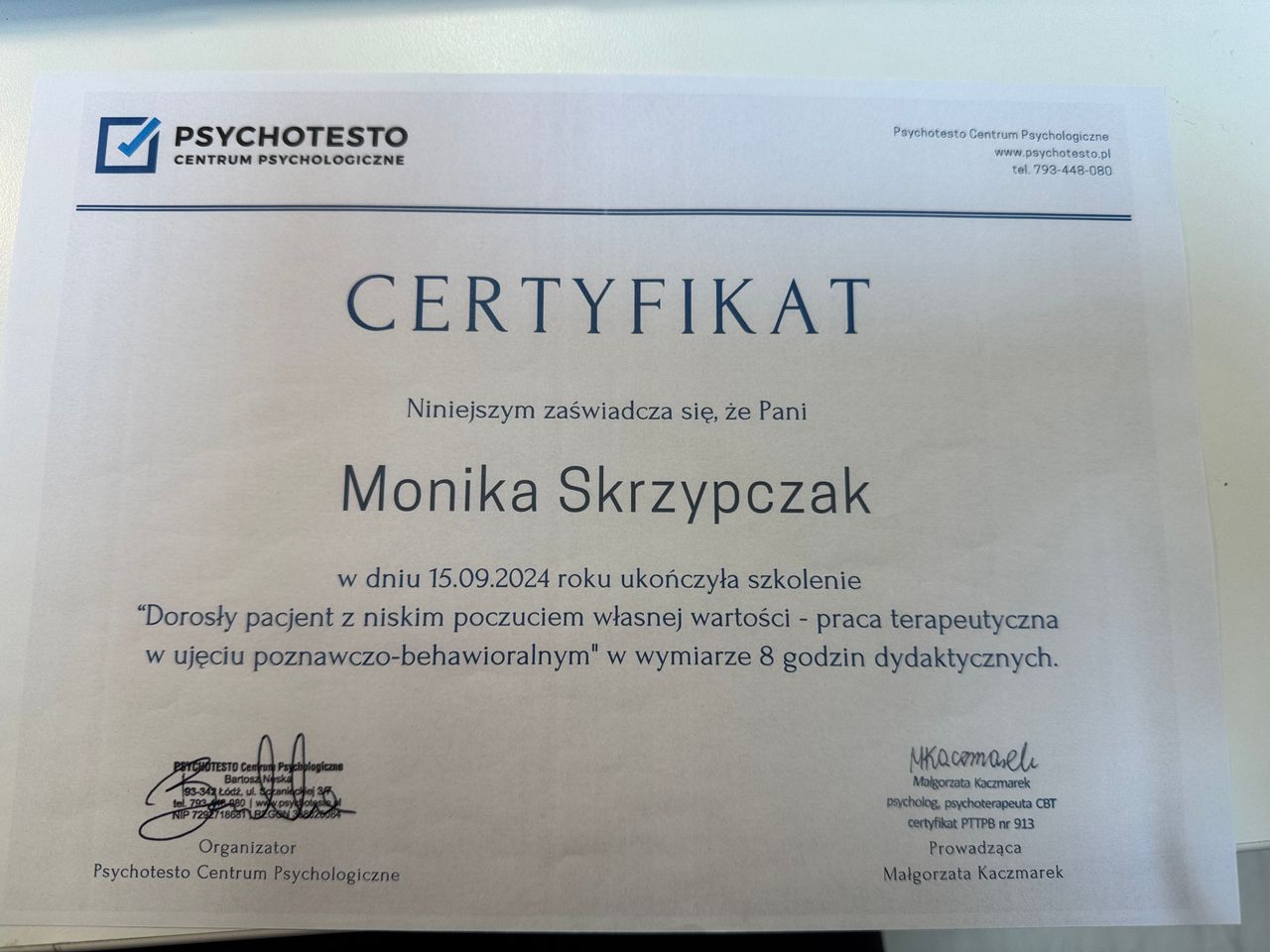 Psychologia od zawsze była moją pasją. Nic nie sprawia mi większej przyjemności jak możliwość zagłębienia się w labiryncie ludzkiego umysłu. Dlatego też podążając za swoim marzeniem zostałam absolwentką psychologii warszawskiego Uniwersytetu SWPS (Filia w Poznaniu). Był to dla mnie czas dużego wysiłku i wielu wyrzeczeń, jednak upór i determinacja pozwoliły mi zrealizować moje największe marzenie. Aktualnie kształcę się w Szkole Psychoterapii Poznawczo-Behawioralnej Uniwersytetu SWPS pod kierownictwem dr hab. Agnieszki Popiel i dr Ewy Pragłowskiej. Ponadto ukończyłam studia podyplomowe z psychologii uzależnień na Uniwersytecie SWPS w Poznaniu. Jestem członkiem Polskiego Towarzystwa Terapii Poznawczej i Behawioralnej.