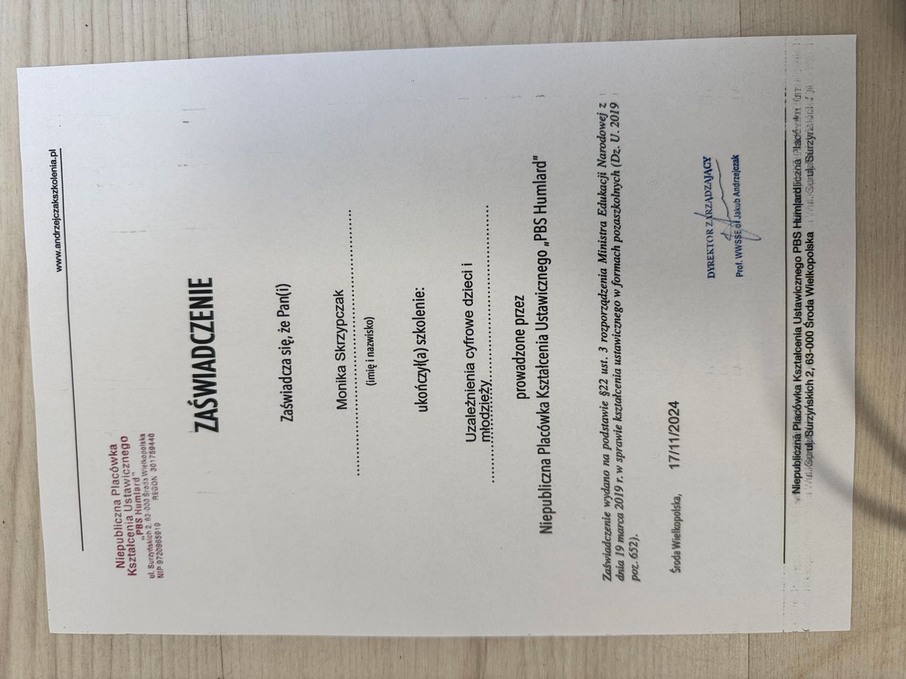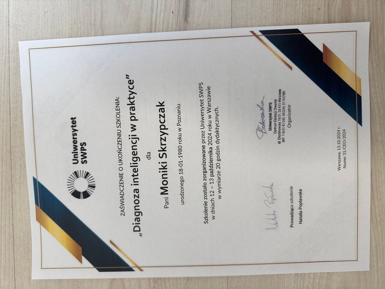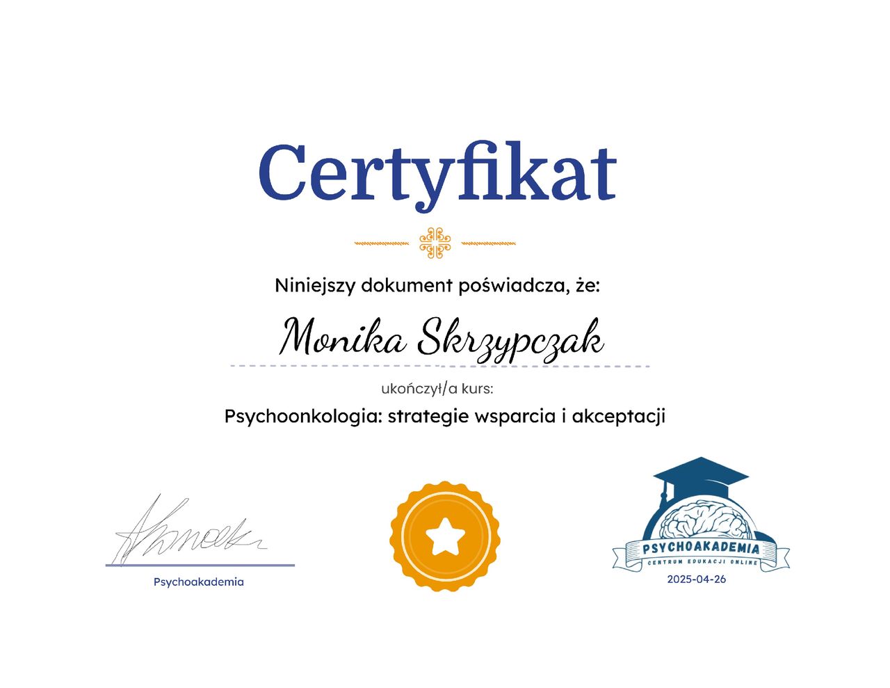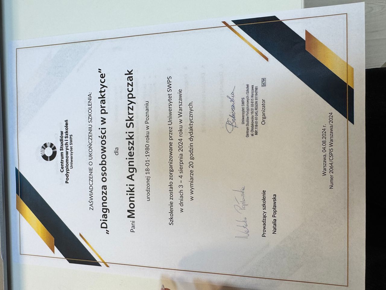 Psychologia od zawsze była moją pasją. Nic nie sprawia mi większej przyjemności jak możliwość zagłębienia się w labiryncie ludzkiego umysłu. Dlatego też podążając za swoim marzeniem zostałam absolwentką psychologii warszawskiego Uniwersytetu SWPS (Filia w Poznaniu). Był to dla mnie czas dużego wysiłku i wielu wyrzeczeń, jednak upór i determinacja pozwoliły mi zrealizować moje największe marzenie. Aktualnie kształcę się w Szkole Psychoterapii Poznawczo-Behawioralnej Uniwersytetu SWPS pod kierownictwem dr hab. Agnieszki Popiel i dr Ewy Pragłowskiej. Ponadto ukończyłam studia podyplomowe z psychologii uzależnień na Uniwersytecie SWPS w Poznaniu. Jestem członkiem Polskiego Towarzystwa Terapii Poznawczej i Behawioralnej.