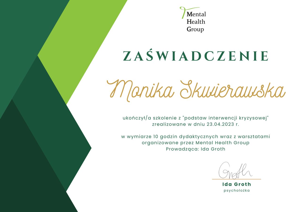 Nazywam się Monika Skwierawska i jestem certyfikowanym psychologiem (Uniwersytet Gdański) oraz psychoterapeutą w trakcie szkolenia w Krakowskim Centrum Psychodynamicznym (KCP), rekomendowanym przez Polskie Towarzystwo Psychologiczne. Oferuję psychoterapię psychodynamiczną dla dorosłych i nastolatków, pomagając radzić sobie z lękiem, niską samooceną, depresją, traumą, problemami psychosomatycznymi, zmianami życiowymi oraz trudnościami w relacjach.