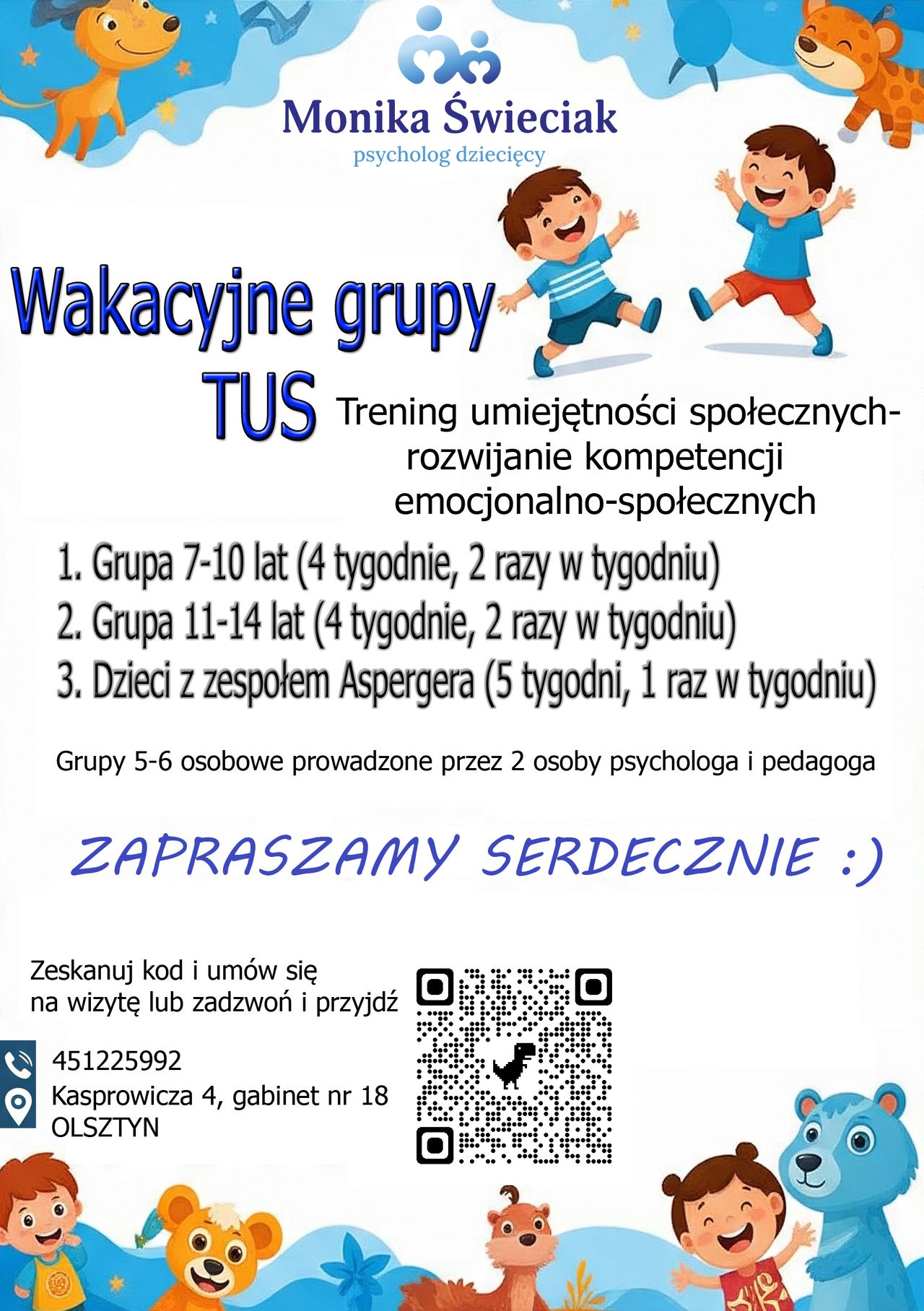 Od poniedziałku 14 lipca godzina 10.00 startuje grupa TUS - wakacyjne rozwijanie kompetencji emocjonalno-społecznych, są jeszcze wolne miejsca- serdecznie zapraszamy:)
