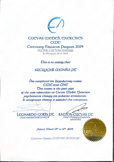 Córka (8 miesięcy) nie zawsze była wzorowym pacjentem ale p. Monika zawsze znalazła sposób, żeby w zabawowej formie „przemycić” ćwiczenia i spotkanie było atrakcją dla małego pacjenta. Intensywna terapia szybko zaczęła przynosić efekty i córka bez problemu osiągała kolejne umiejętności.