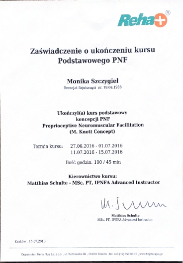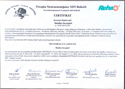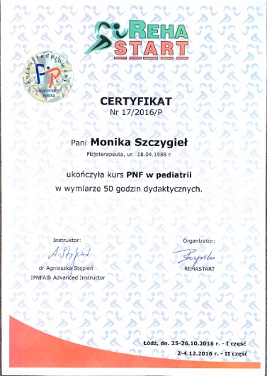 W swojej pracy głównie wykorzystuje wiedzę zdobytą na kursach NDT Bobath, PNF i CME Medek oraz 9 letnie doświadczenie zdobywane na Oddziale Neurologii Dziecięcej.