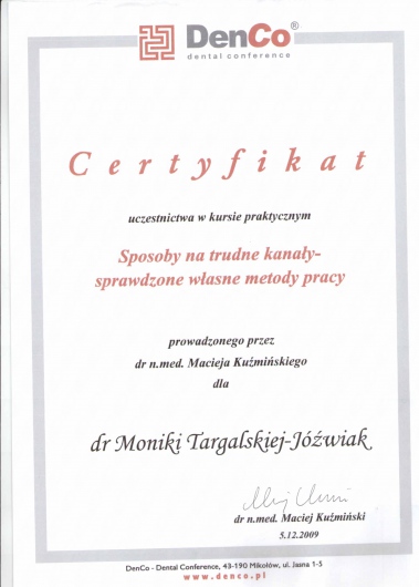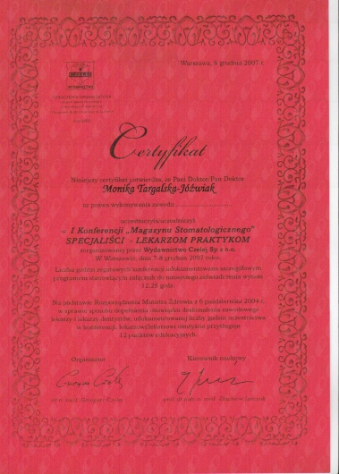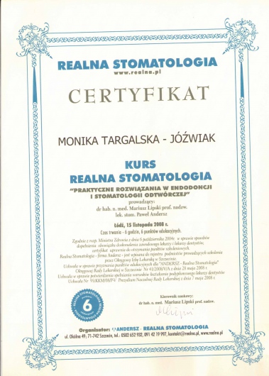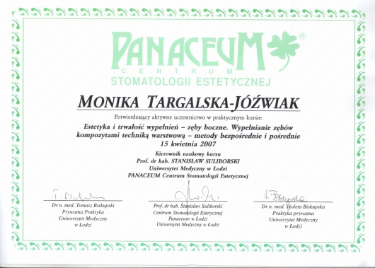 lekarz stomatolog. Absolwentka Akademii Medycznej w Łodzi. Lekarz uczestniczący w licznych kursach szkoleniowych dotyczących stomatologii zachowawczej. Posiada bardzo dobre wyniki leczenia. Charakteryzuje się dobrym wyczuciem estetyki.