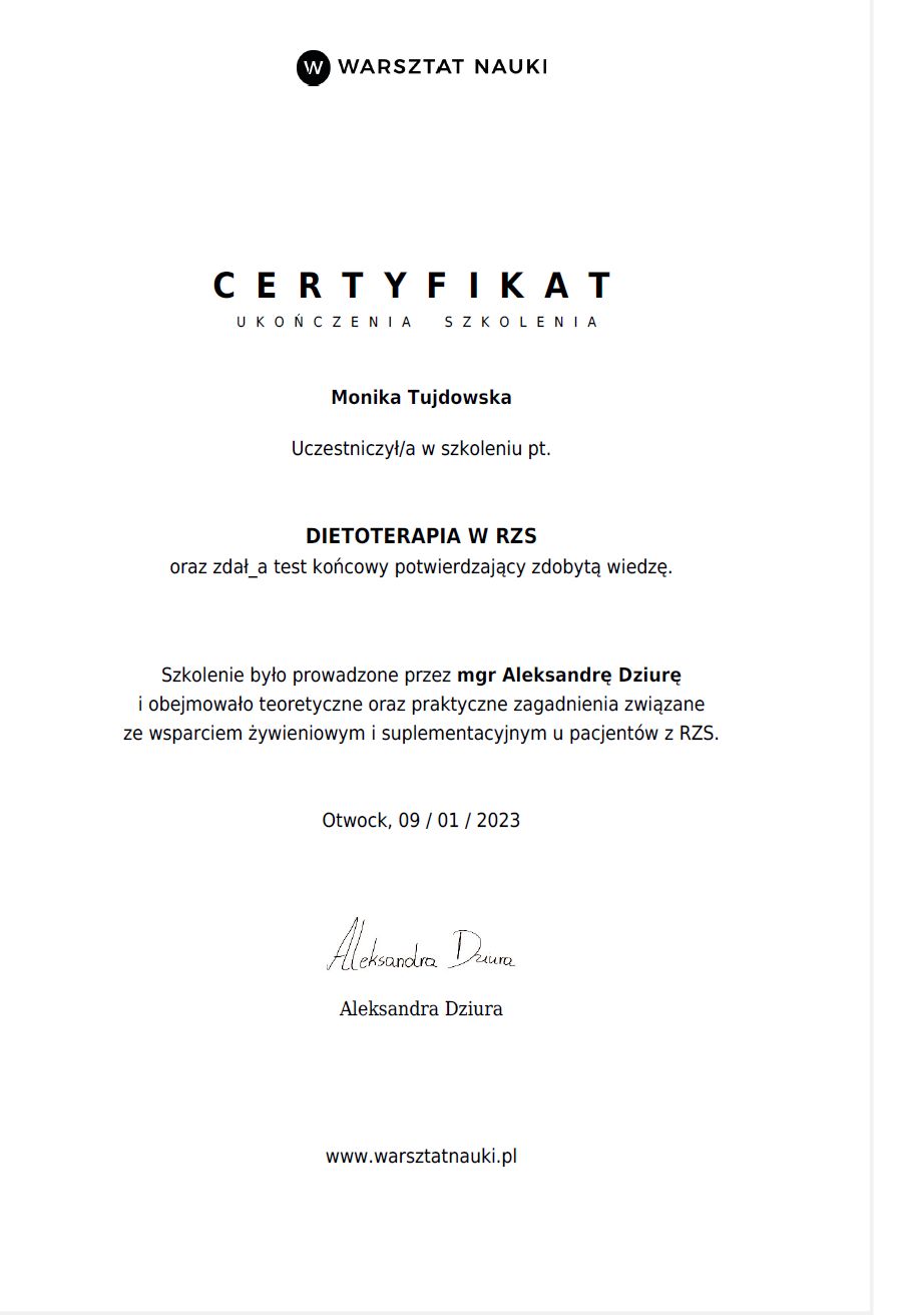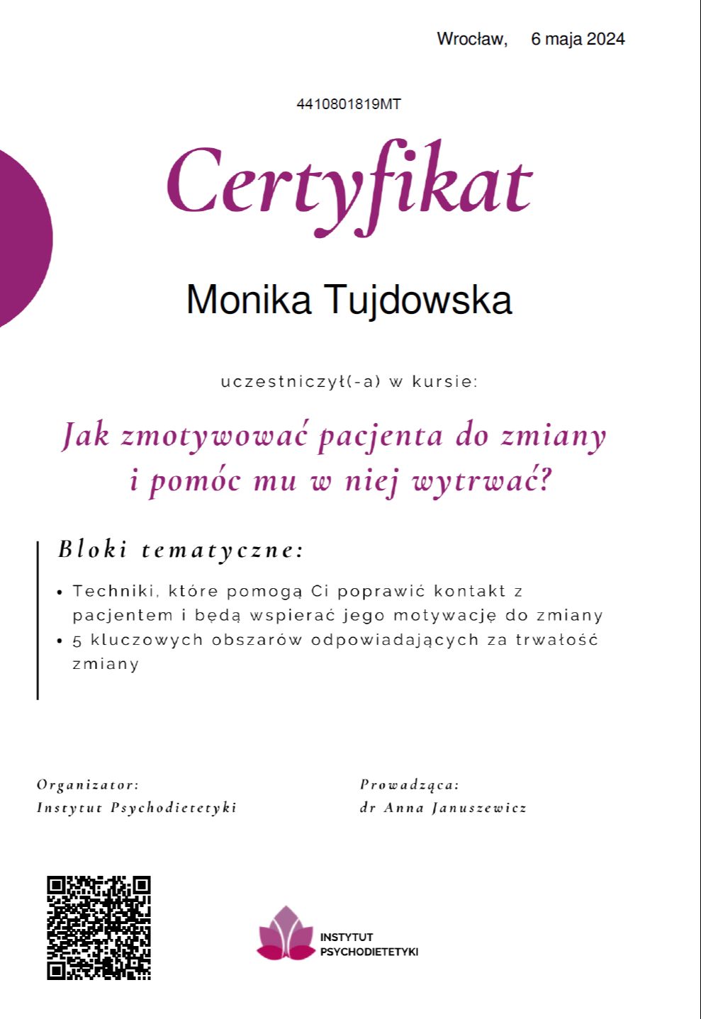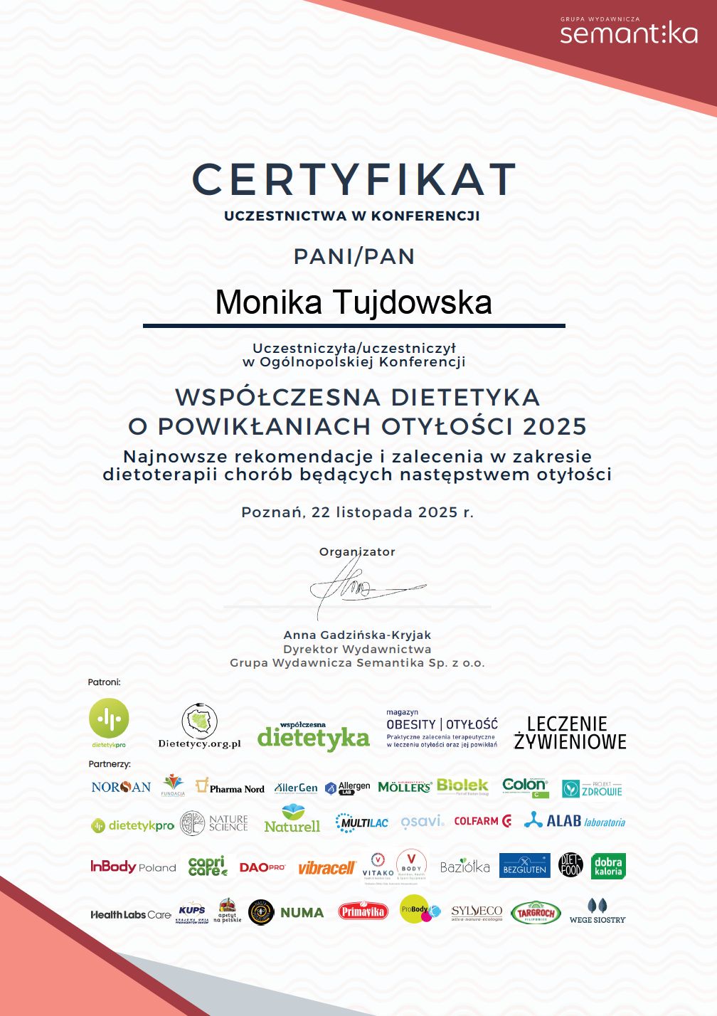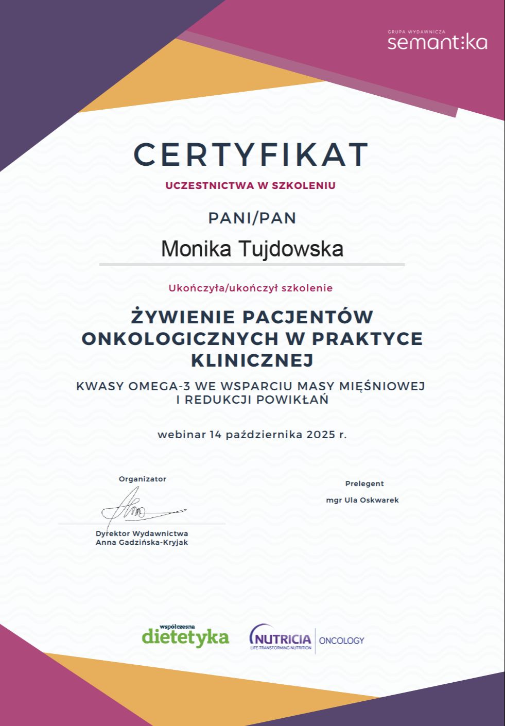 Nazywam się Monika Tujdowska, jestem dietetykiem klinicznym oraz psychodietetykiem. W swojej pracy patrzę na pacjenta całościowo, łącząc wiedzę z zakresu dietetyki, medycyny i psychologii.
