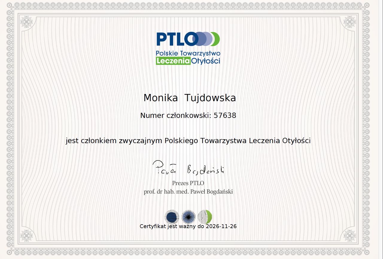 Jestem członkiem Polskiego Towarzystwa Leczenia Otyłości, co pozwala mi pracować zgodnie z najnowszymi standardami i zaleceniami w terapii zaburzeń masy ciała.