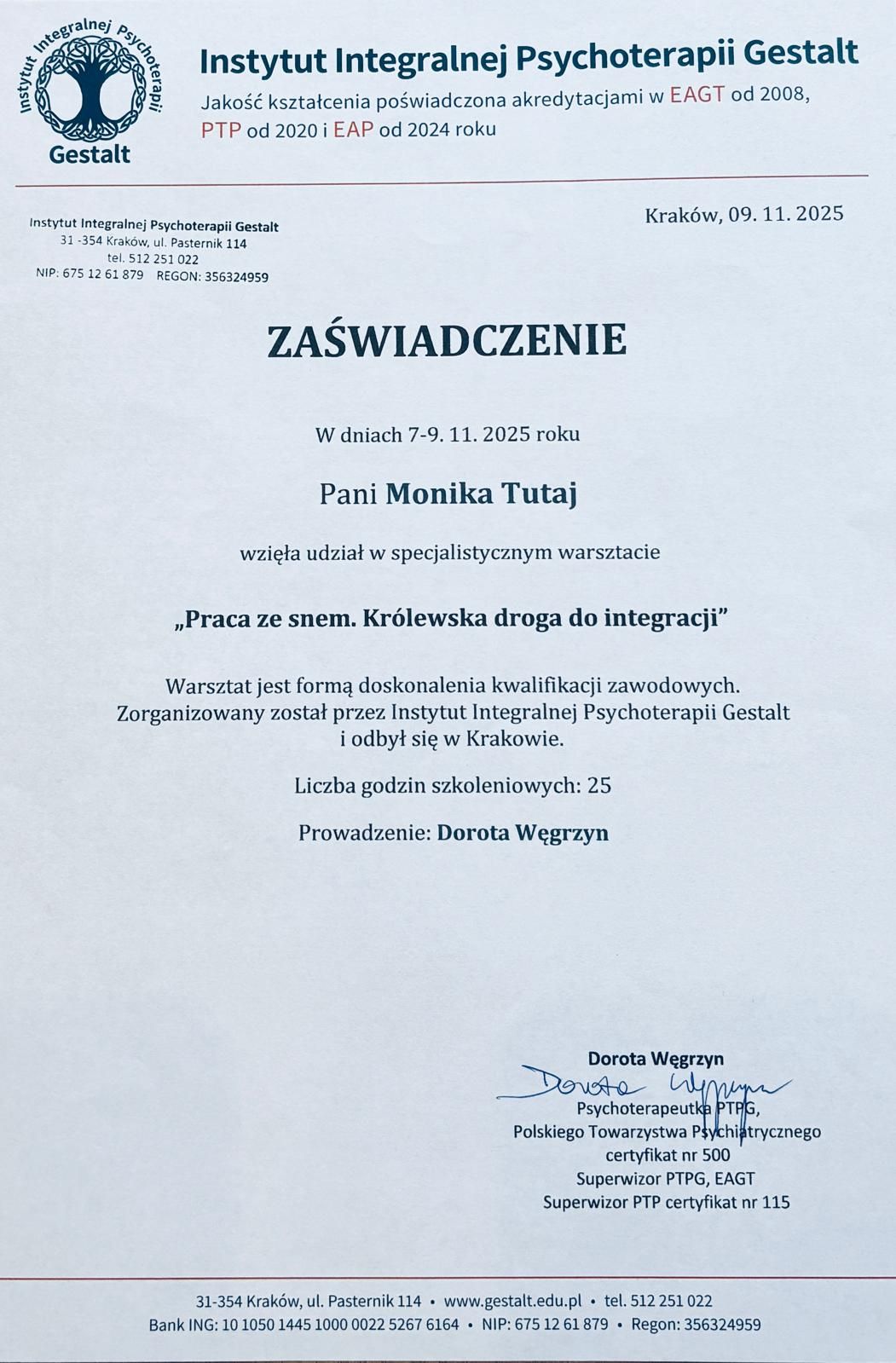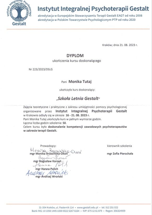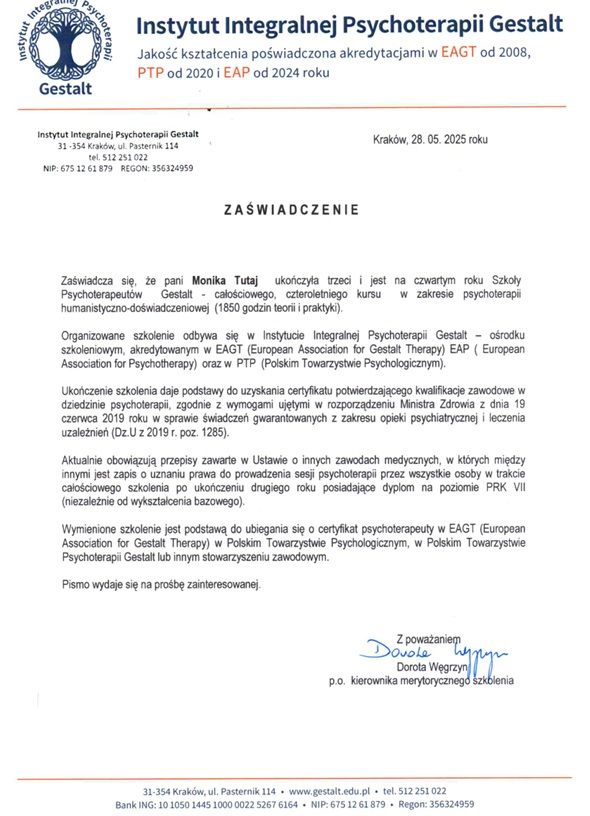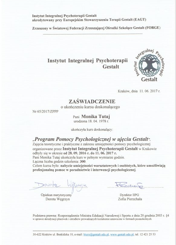 Swoje kompetencje psychoterapeutyczne rozwijam w Instytucie Integralnej Psychoterapii Gestalt w Krakowie, akredytowanym przez Europejskie Stowarzyszenie Psychoterapii Gestalt (EAGT) i Polskie Towarzystwo Psychologiczne (PTP).