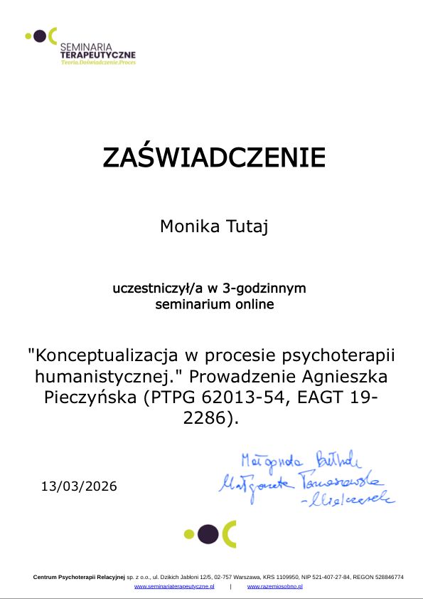 Pani Monika jest uważna na człowieka, a nie na gotowe metody, dzięki czemu każde spotkanie ma indywidualny sens i kierunek.