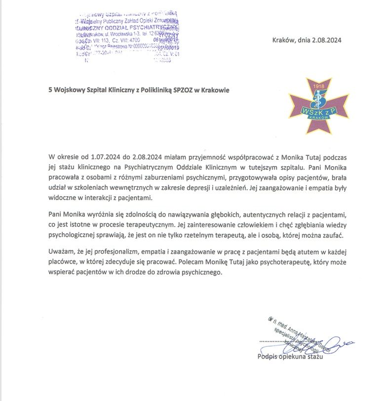 Pani Monika to niezwykle empatyczna, uważna i profesjonalna osoba. Już od pierwszego spotkania czułem się zrozumiany. Stworzyła bezpieczną przestrzeń, w której mogłem otwarcie mówić o swoich trudnościach. Jej spokój, trafne pytania i pełne zrozumienia podejście sprawiły, że nasze spotkanie było dla mnie bardzo wartościowe i dało mi nową perspektywę. Z całego serca polecam – to specjalistka z ogromnym zaangażowaniem i pasją.