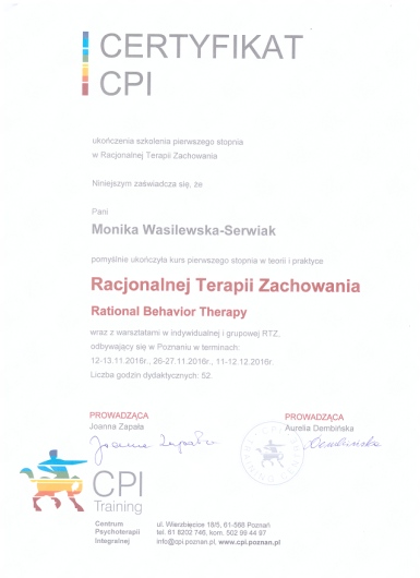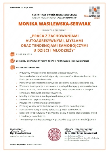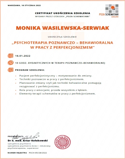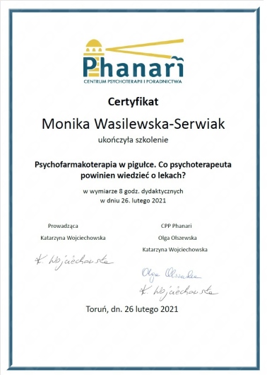 Jestem członkinią Polskiego Towarzystwa Terapii Poznawczej i Behawioralnej obecnie w trakcie certyfikacji. Doświadczenia zdobywałam w Poradni Zdrowia Psychicznego MSWiA w Szczecinie oraz Poradni Zdrowia Psychicznego NZOZ Tarczyn koło Warszawy. Obecnie prowadzę prywatną praktykę psychoterapeutyczną.