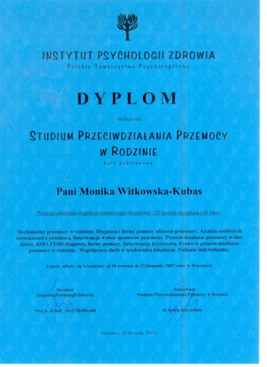 Pełen profesjonalizm, zrozumienie, otwartość, umiejętność słuchania. Dzięki Pani Monice wyszłam z przemocy domowej. Nie zostawiła mnie, nie krytykowała kiedy upierałam się przy swoich racjach i chęci dawania kolejnych szans dla uratowania związku. Jest to osoba przy której nie odczuwałam skrępowania, niższości, nie czułam się gorsza, a wręcz przeciwnie pomagała mi budować swoją pewność siebie, wzmacniała poczucie mojej wartości.