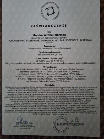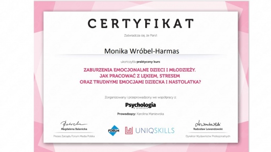 Jaki jest zakres porad oferowanych przez Monika Wróbel-Harmas?Monika Wróbel-Harmas to psychoterapeuta, psycholog. Na podstawie swojego doświadczenia i wykształcenia Monika Wróbel-Harmas oferuje usługi takie jak: Psychoterapia, psychoterapia partnerska, psychoterapia indywidualna, psychoterapia rodzinna, konsultacja psychoterapeutyczna, konsultacja psychologiczna (kolejna wizyta), Konsultacja Wideo - Psychologa pierwszorazowa, Terapia psychologiczna - konsultacja wideo, psychoterapia uzależnień, mediacje dla par.