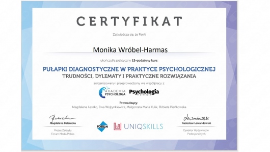 Pani Monika jest dla mnie idealnym przewodnikiem w odkrywaniu istoty problemu, czy chodzi o trudności rodzinne, prywatne czy służbowe. Jest jak dobry śledczy, gdy łapie trop, więc pomaga jasno sobie przedstawić problem. Najważniejsze jednak dla mnie jest przy każdym spotkaniu to, że jest moim sprzymierzeńcem, więc szacun za dobrze rozumianą empatię. Poza tym jest czujna i zaangażowana, więc każda minuta spotkania jest dobrze wykorzystana, a to wszystko w dobrej atmosferze i z poczuciem humoru, bo jest bezcenne, jeśli można wyjść z terapii nie tylko z pracą domową, ale też z uśmiechem.