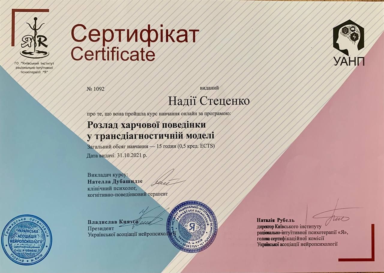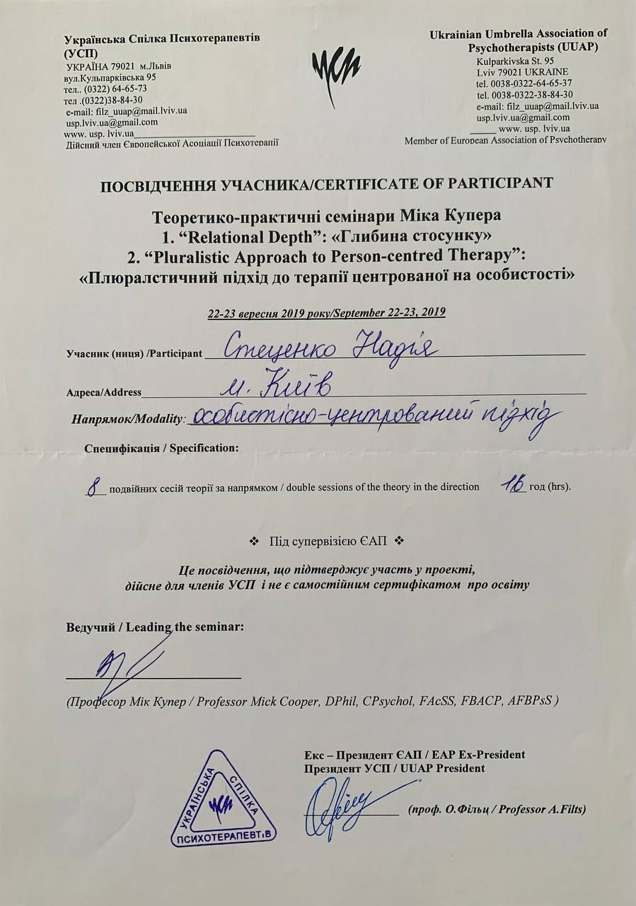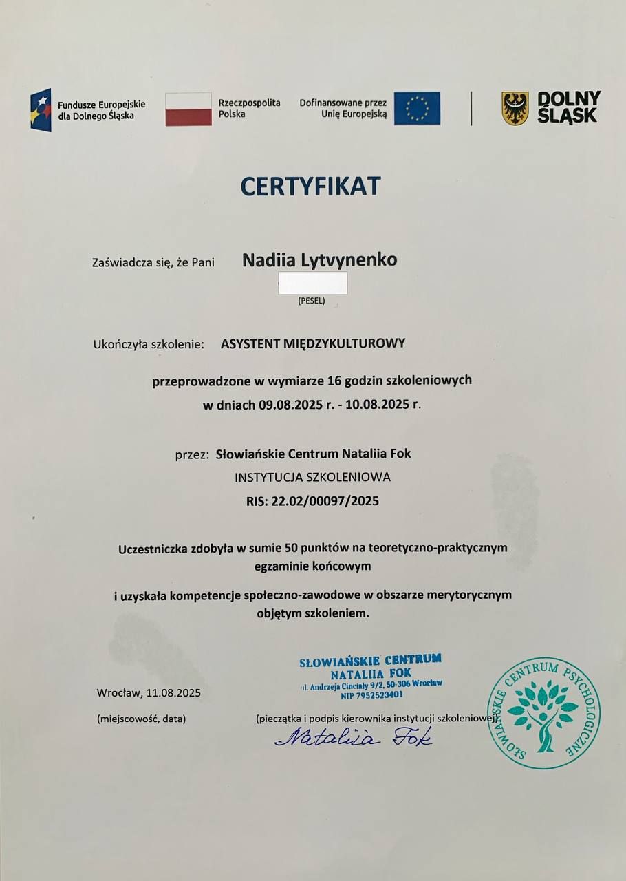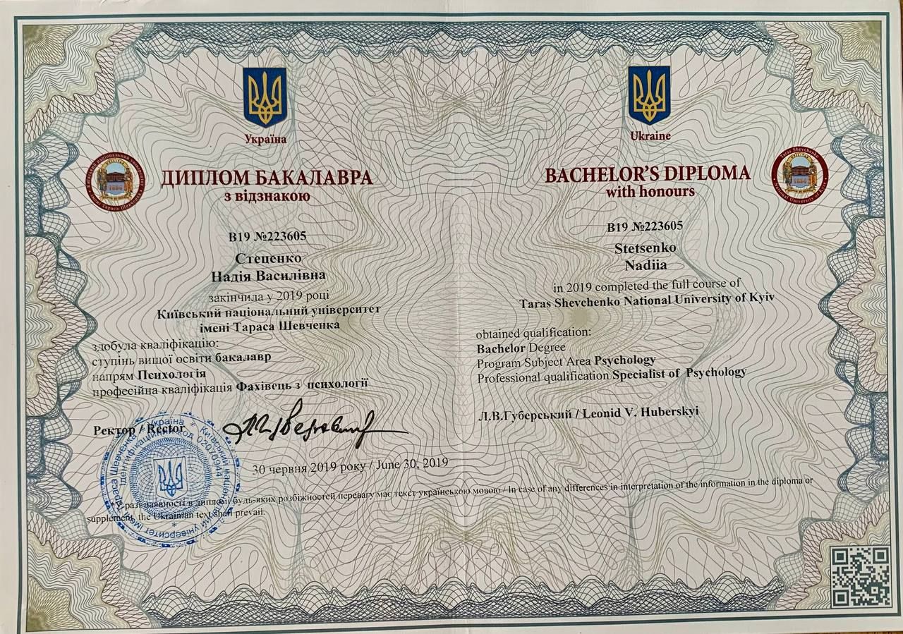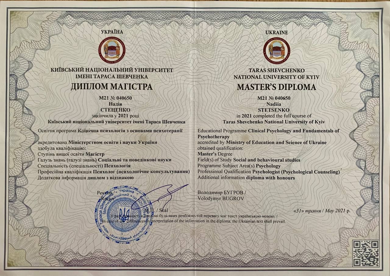 PL Uzyskałam tytuł magistra psychologii klinicznej na Narodowym Uniwersytecie im. Tarasa Szewczenki w Kijowie. Ciągle uczę się nowych technik i metod pomocy psychologicznej.