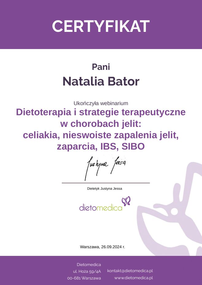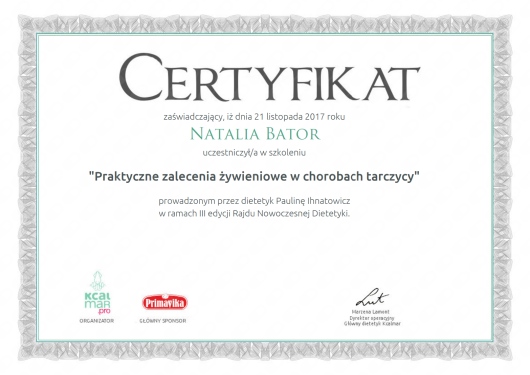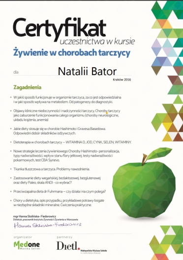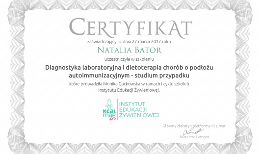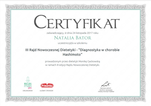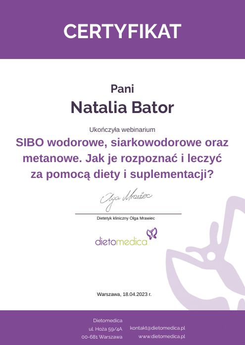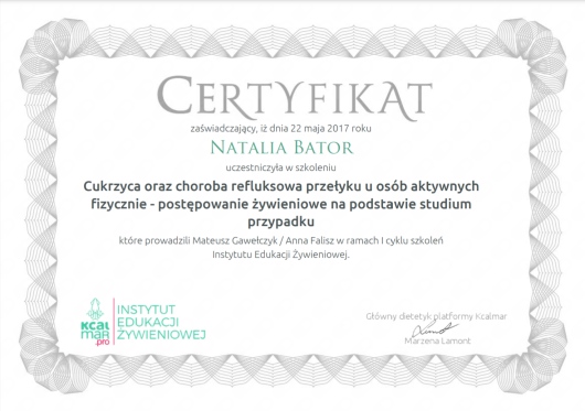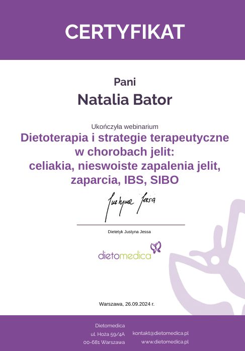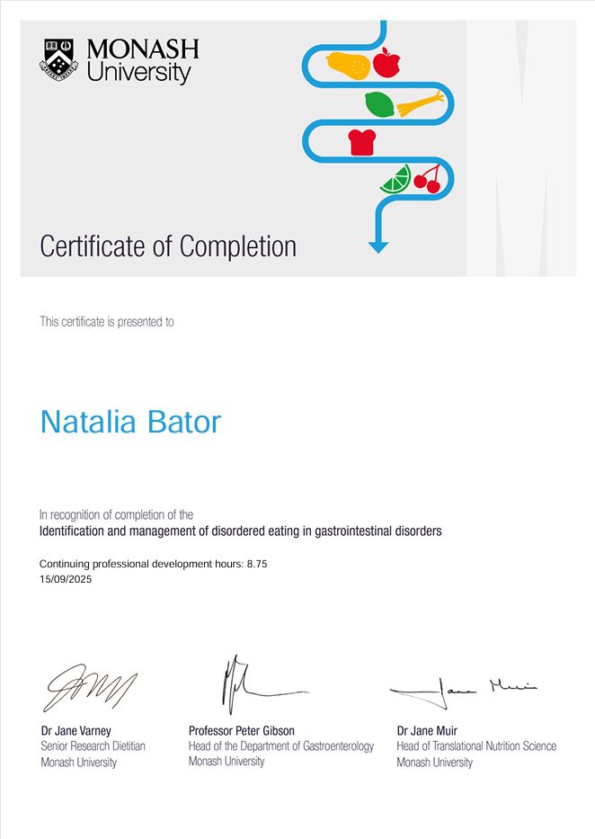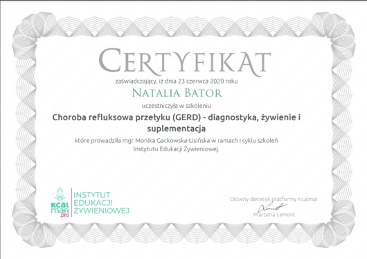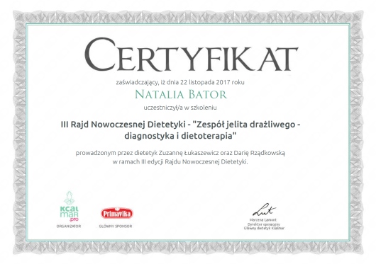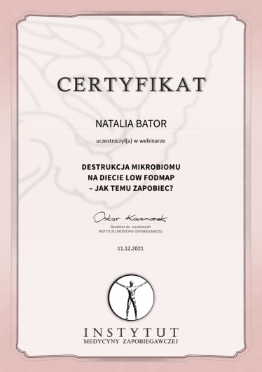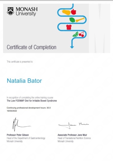 - Low fodmap diet, Monash University (certyfikowany ekspert z zakresu prowadzenia pacjentów na diecie low-fodmap)