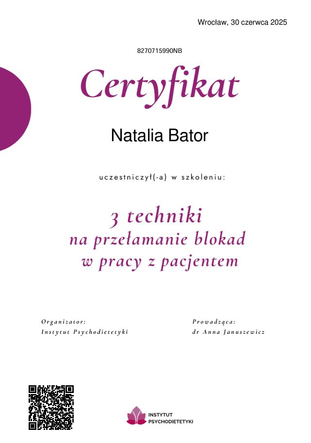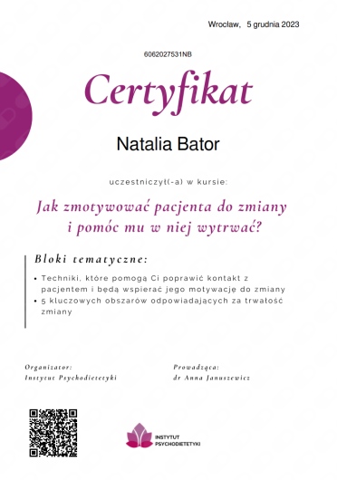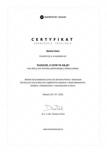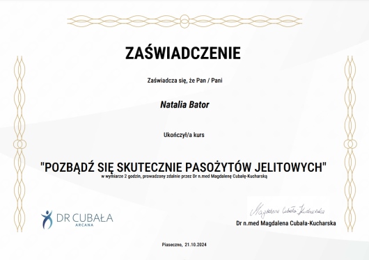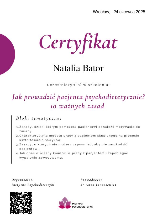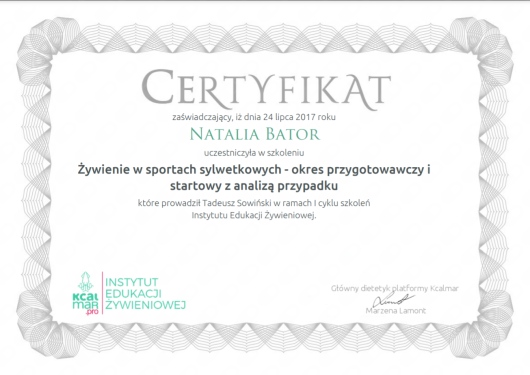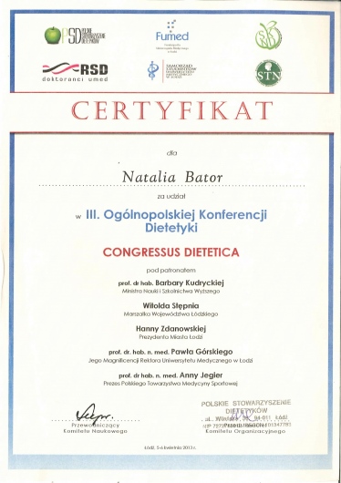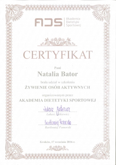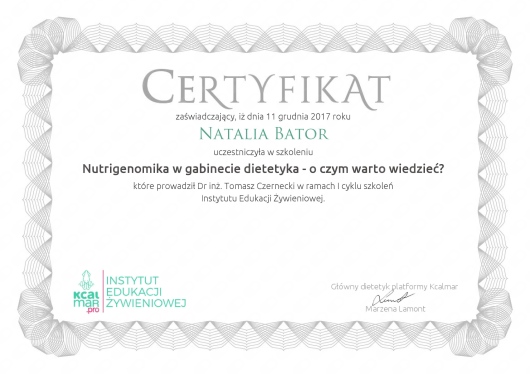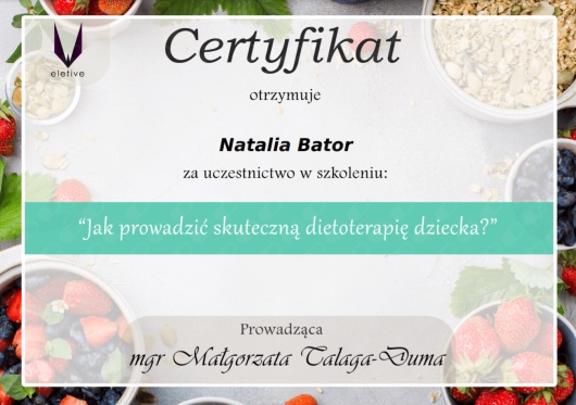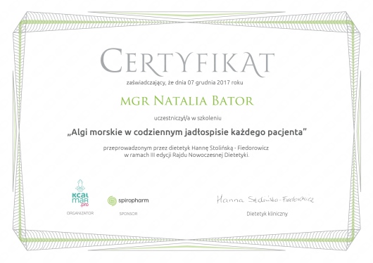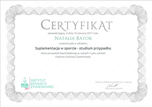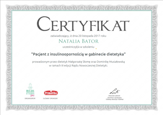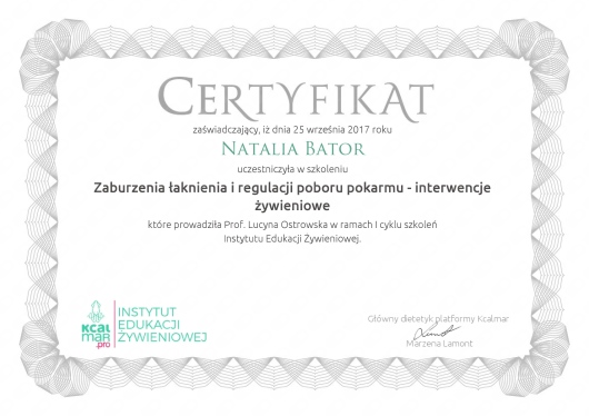 - Low fodmap diet, Monash University (certyfikowany ekspert z zakresu prowadzenia pacjentów na diecie low-fodmap)