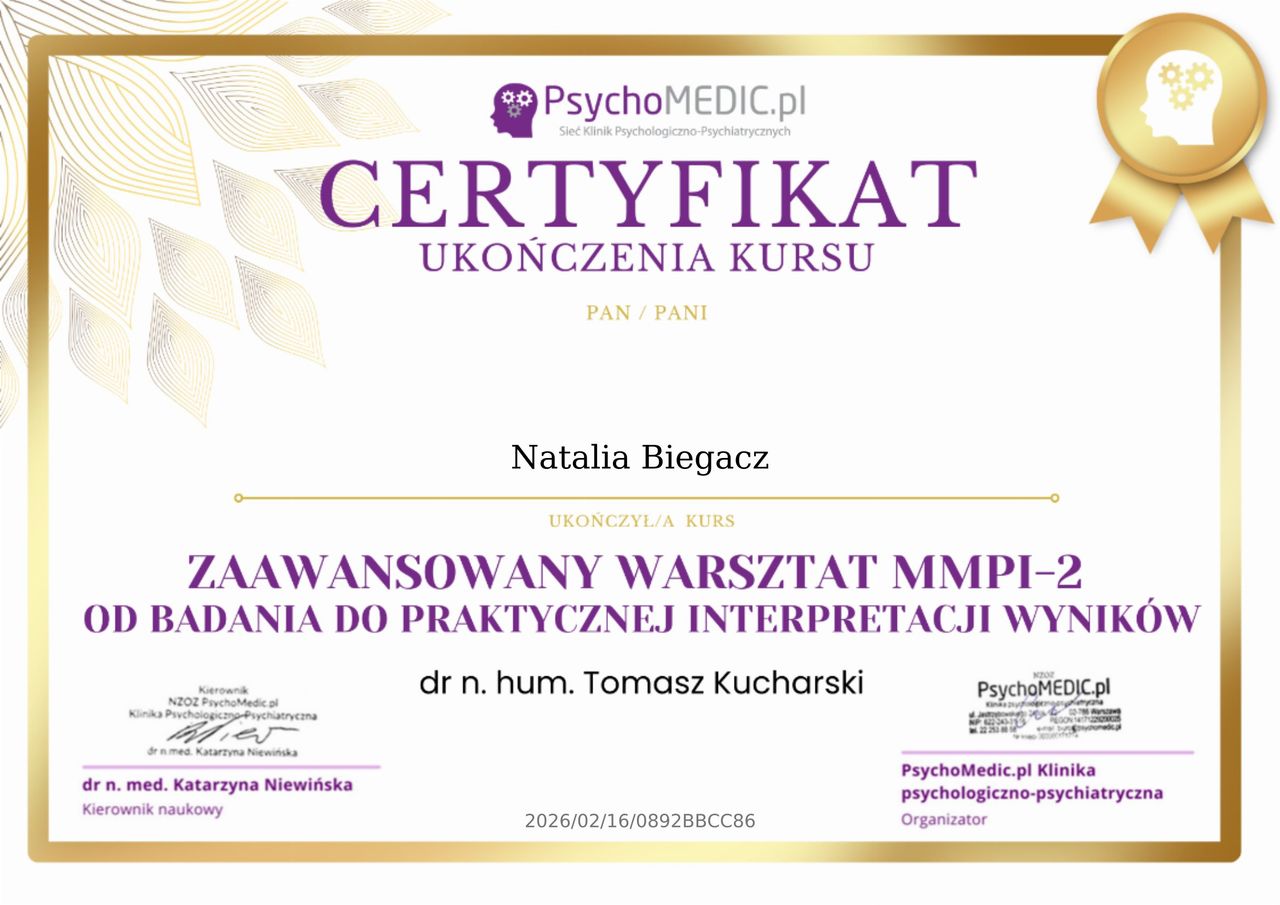 Jaki jest zakres porad oferowanych przez Natalia Biegacz?Natalia Biegacz to psycholog. Na podstawie swojego doświadczenia i wykształcenia Natalia Biegacz oferuje usługi takie jak: Psychotesty dla kierowców i operatorów, Diagnoza psychologiczna, Konsultacja psychologiczna, Diagnoza ADHD, zaświadczenie psychologiczne + opinia, Badanie MMPI-2.