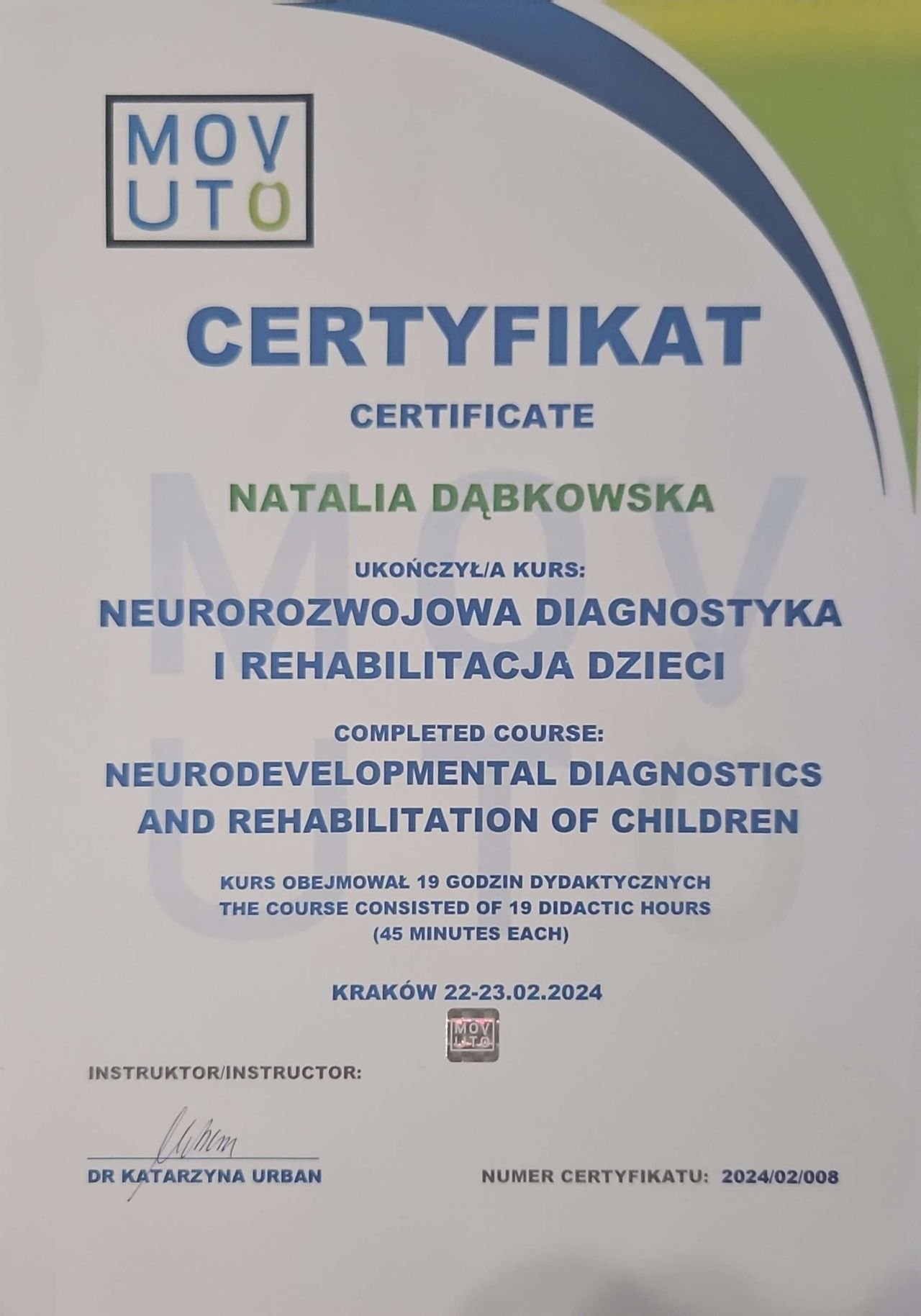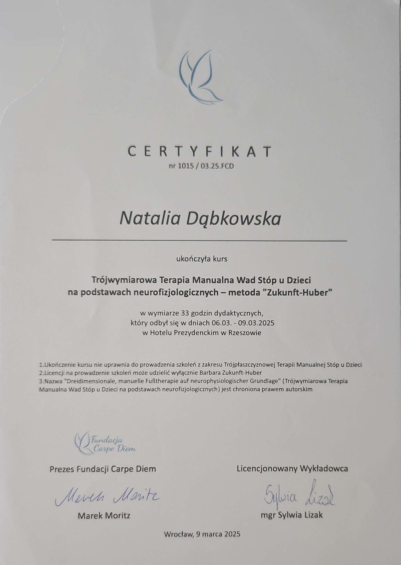 Ukończyłam studia magisterskie na Uniwersytecie Medycznym w Łodzi oraz szereg szkoleń takich jak NDT Bobath, FITS (Funkcjonalna Indywidualna Terapia Skolioz), Integracja Sensoryczna, Trójpłaszczyznowa Terapia Wad Stóp, Neurorozwojowa Diagnostyka i Rehabilitajca Dzieci, Terapia Osteopstyczna w Pediatrii i inne), aby jak najlepiej pomóc moim pacjentom.