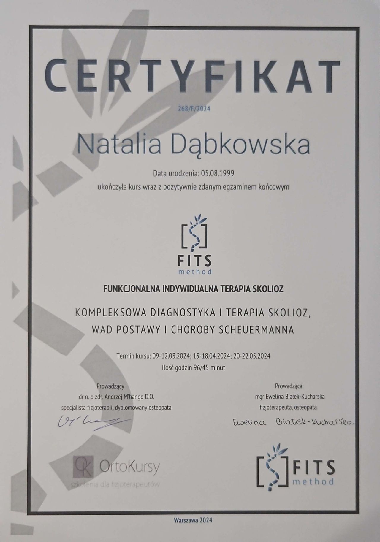 Do pani Natalii chodzimy z dzieckiem na regularną terapię z powodu skoliozy. Jesteśmy bardzo zadowoleni z efektów i z podejścia tej pani do młodego pacjenta. Jest zdecydiwanie kompetentna, dokładna i zaangażowana w każdy etap terapii. Fizjoterapeutka, która potrafi wspaniale nawiązać kontakt z dzieckiem, zajęcia przebiegają w miłej atmosferze, a jednocześnie są bardzo skuteczne. Pani Natalia tłumaczy w sposób zrozumiały, dba o prawidłowe wykonywanie ćwiczeń i motywuje do pracy także w domu.