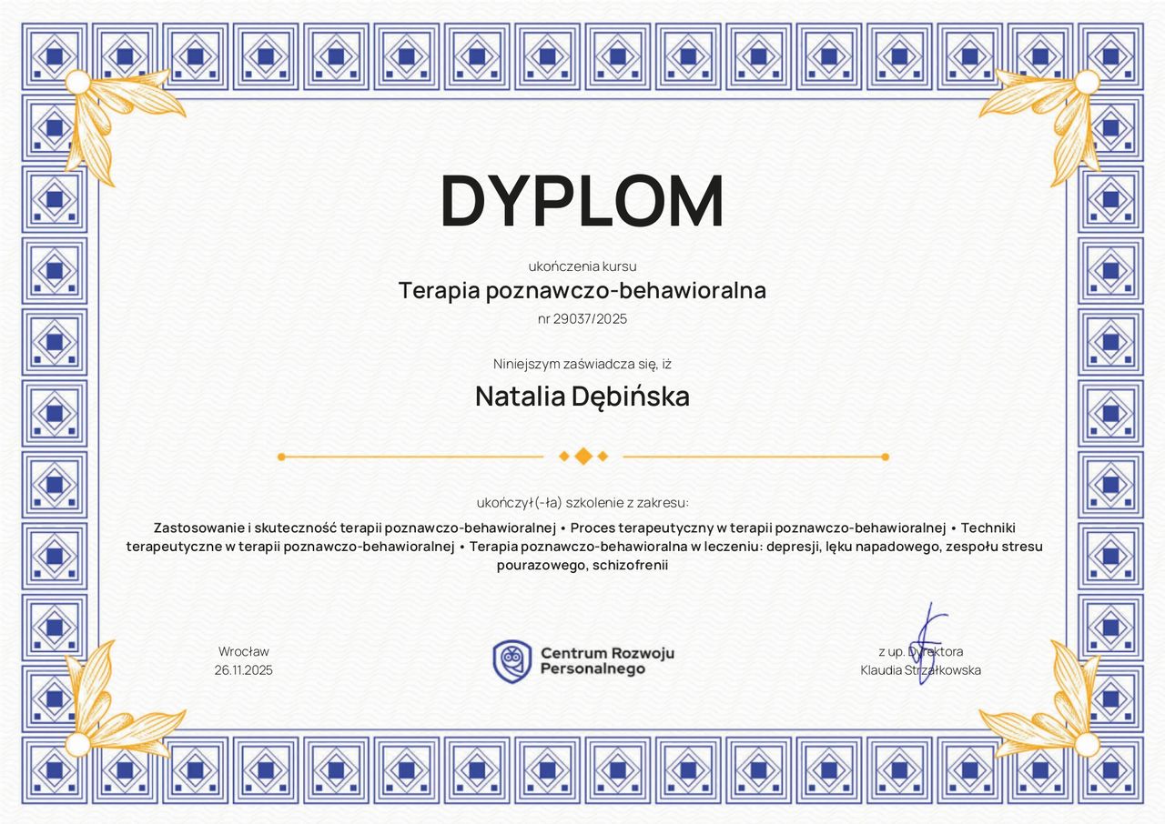 Pracuję w nurcie poznawczo-behawioralnym, opierając swoją praktykę na połączeniu solidnych podstaw teoretycznych i empatycznego podejścia do człowieka. W centrum mojej pracy znajduje się zrozumienie relacji między myślami, emocjami i zachowaniami oraz stopniowa zmiana tych elementów, które powodują cierpienie i utrudniają codzienne funkcjonowanie. Wspieram osoby dorosłe zmagające się ze stresem, obniżonym nastrojem, przewlekłym zmęczeniem, trudnościami w regulacji emocji, problemami w relacjach oraz przeciążeniem zawodowym.