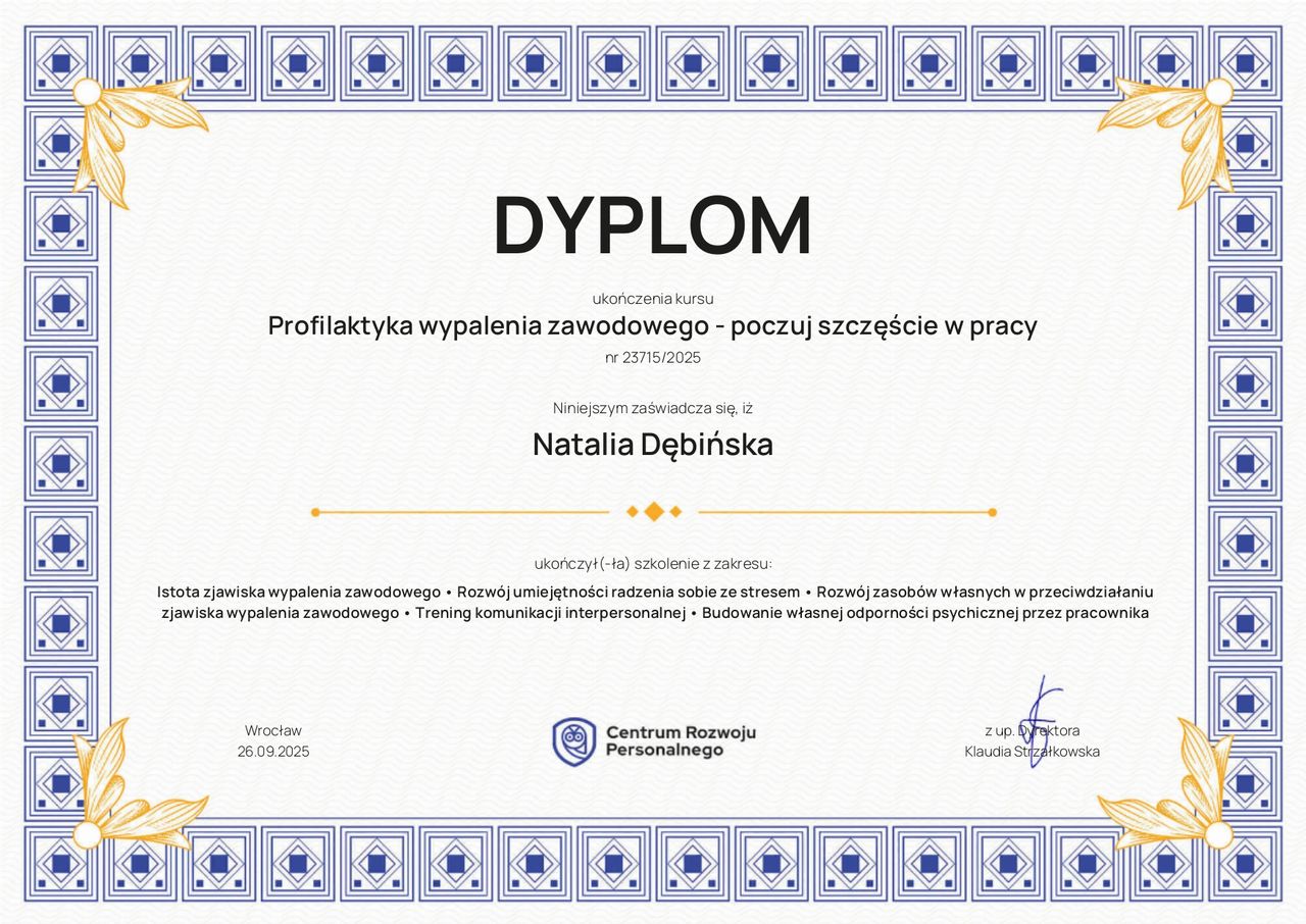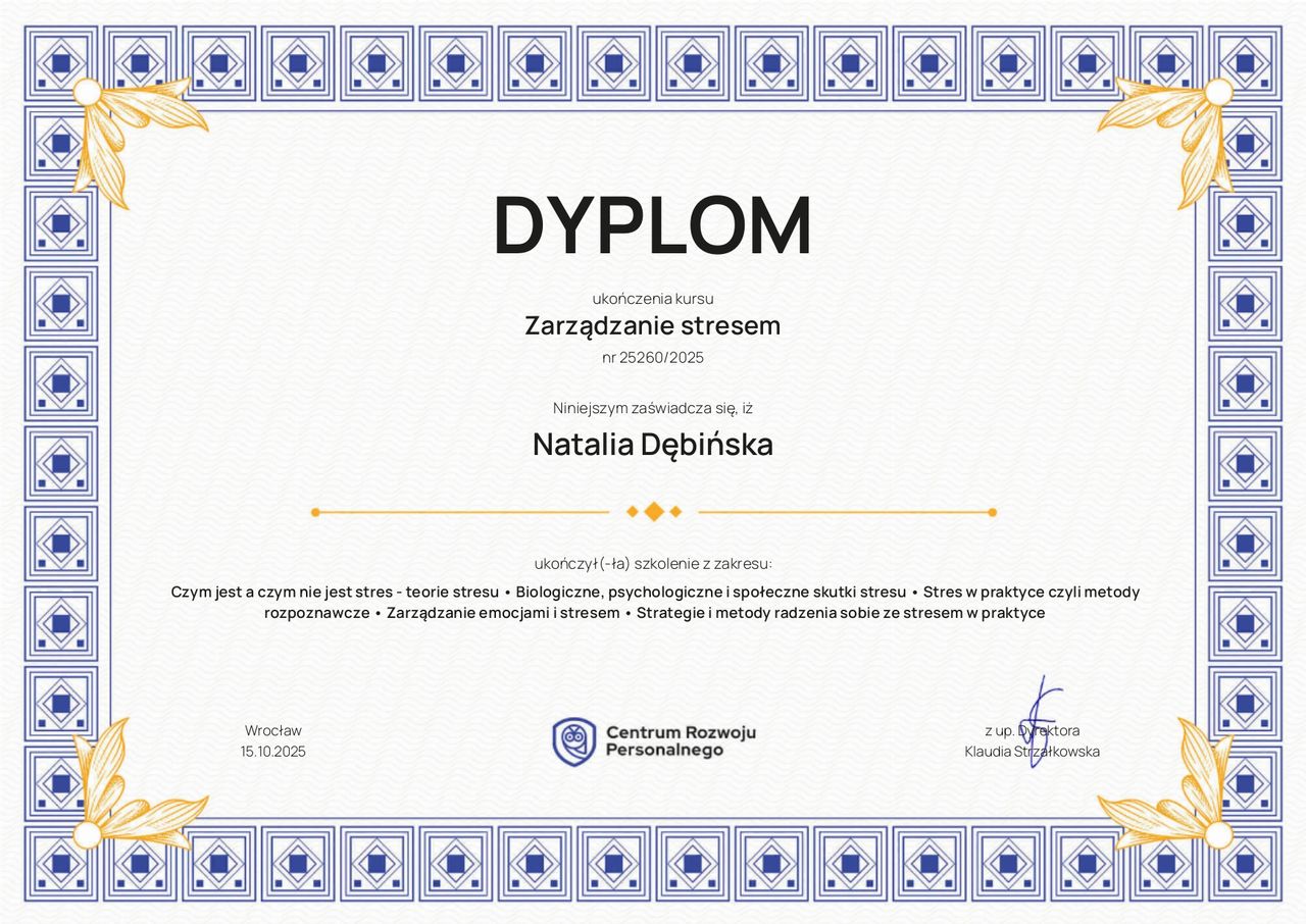 Ukończyłam studia magisterskie z psychologii na Uniwersytecie Frycza-Modrzewskiego w Krakowie, gdzie zdobyłam solidne przygotowanie teoretyczne i praktyczne do pracy z dorosłymi. Swoje kompetencje systematycznie rozwijam, regularnie uczestnicząc w kursach i szkoleniach podnoszących kwalifikacje. Dzięki temu mogę opierać swoją pracę na aktualnej wiedzy psychologicznej oraz narzędziach, które realnie wspierają proces zmiany u moich klientów.