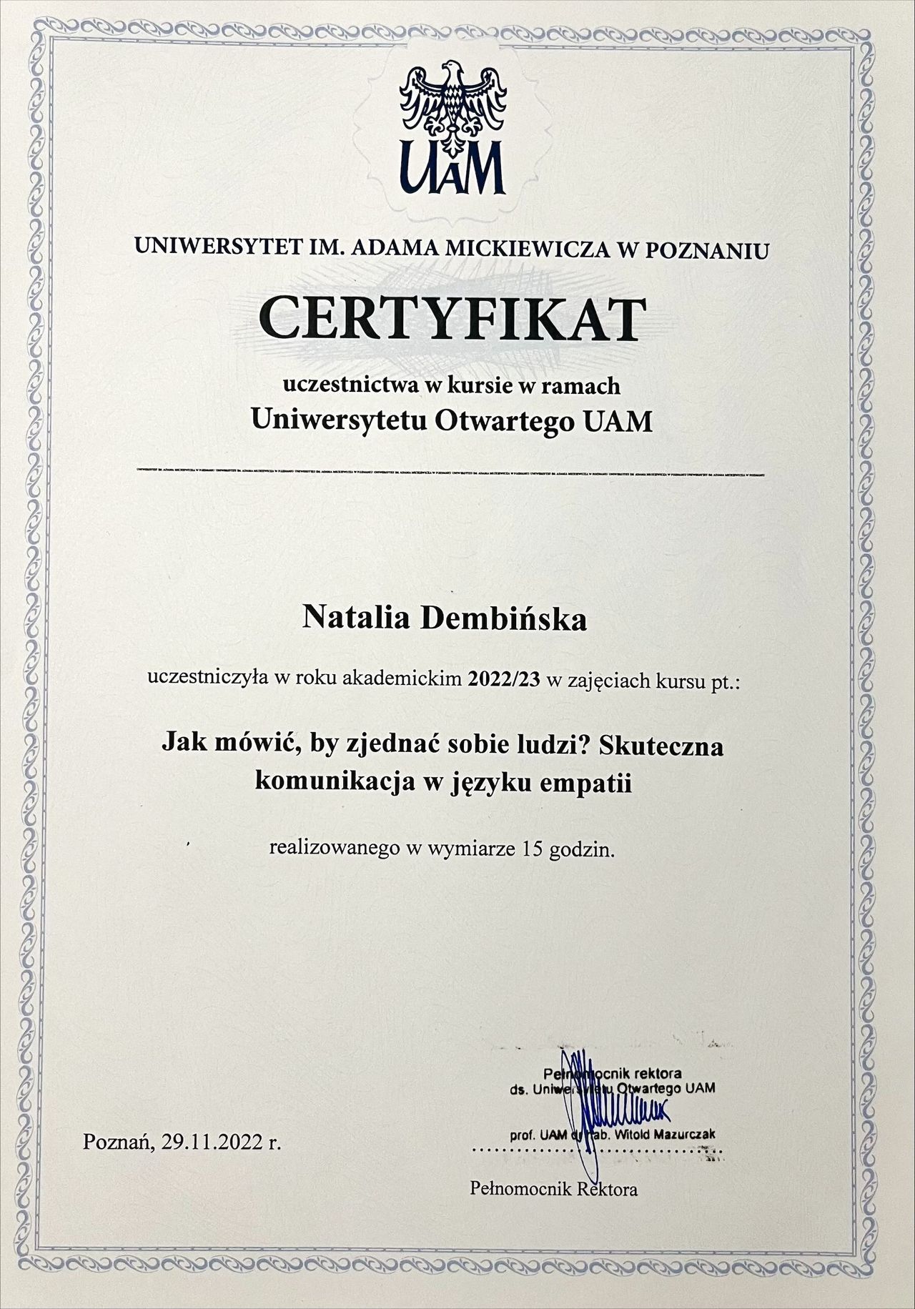 potkania z Panią Natalią były dla mnie naprawdę pomocne i wartościowe. Czułam, że mogę swobodnie mówić o swoich sprawach, a Pani Natalia słuchała z pełnym zrozumieniem i zaangażowaniem. Dzięki jej empatii rozmowy przebiegały w ciepłej, bezpiecznej atmosferze. Otrzymałam wiele trafnych spostrzeżeń i wskazówek, które pomogły mi lepiej zrozumieć siebie.