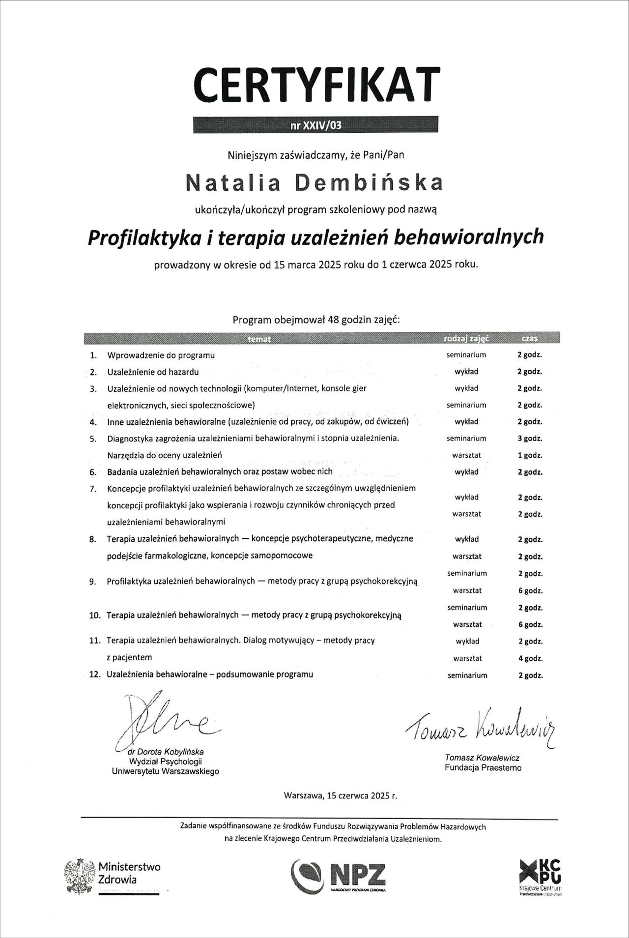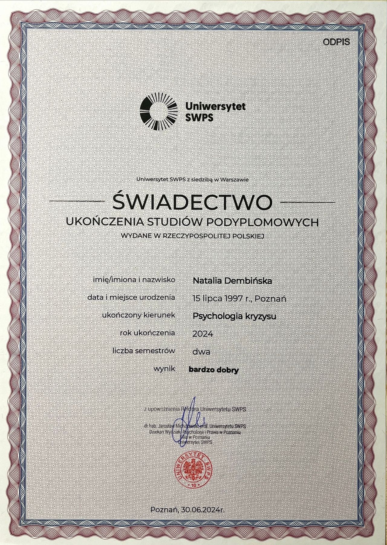 Jestem psycholożką i psychoterapeutką w trakcie całościowego szkolenia w nurcie psychodynamicznym w Krakowskim Centrum Psychoterapii Psychodynamicznej. Ukończyłam studia magisterskie na Uniwersytecie im. Adama Mickiewicza w Poznaniu oraz studia podyplomowe z psychologii kryzysu na Uniwersytecie SWPS. Swoje kompetencje poszerzyłam także, kończąc kurs z zakresu profilaktyki i terapii uzależnień behawioralnych.