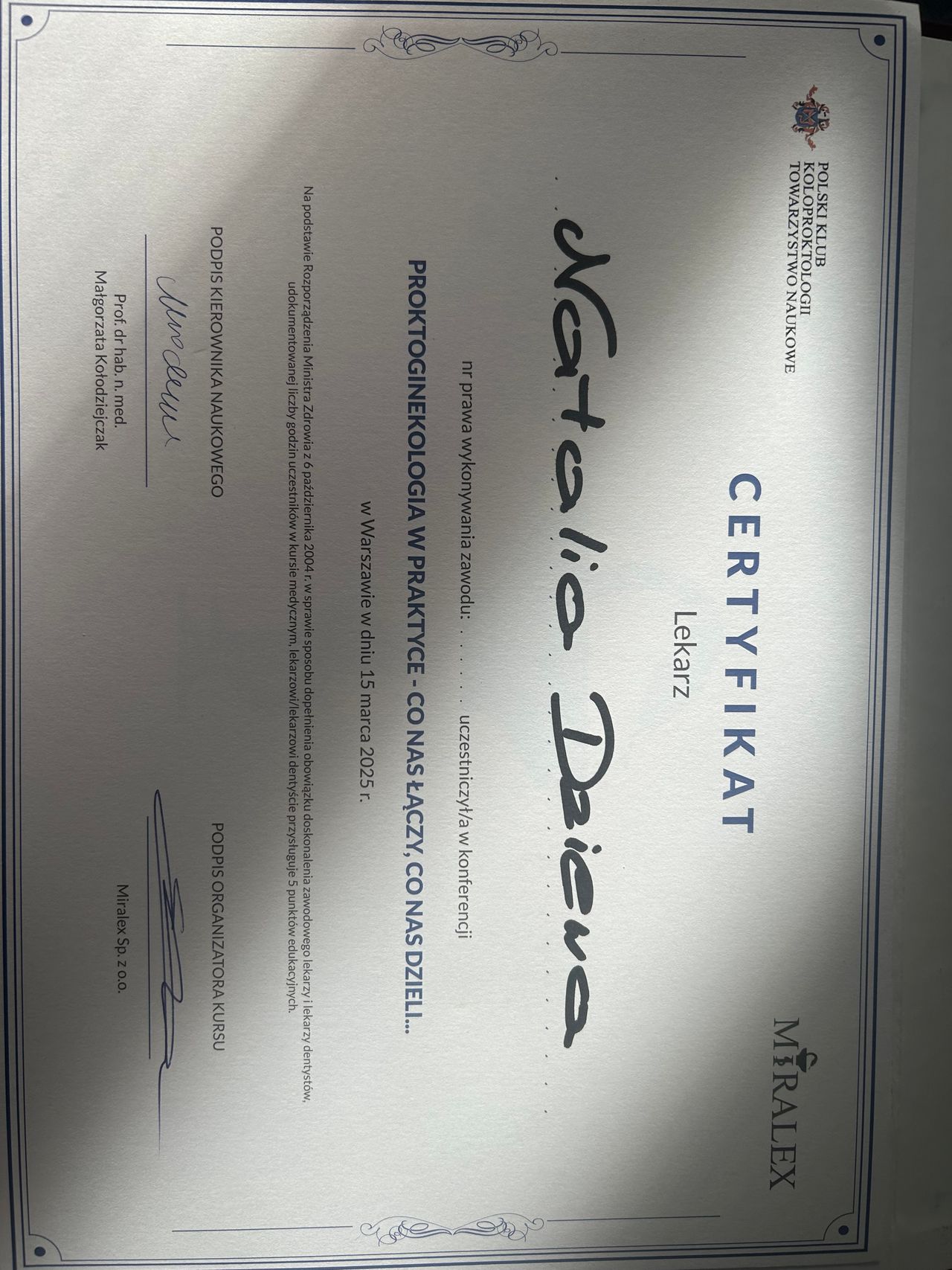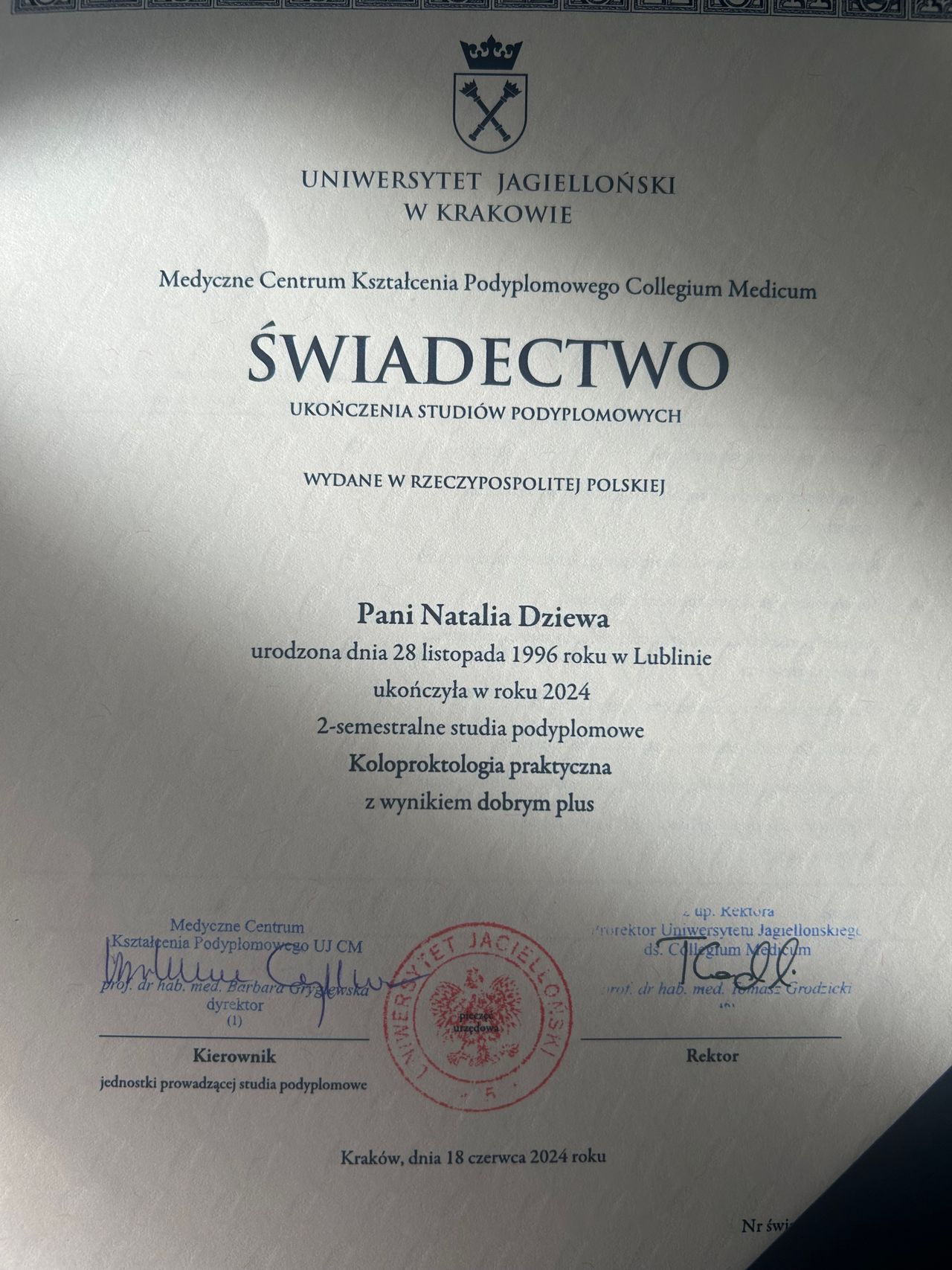 Lek. Natalia Dziewa to lekarz z pasją, w trakcie specjalizacji z chirurgii ogólnej, która od początku swojej kariery zawodowej skupia się na nowoczesnej diagnostyce i leczeniu schorzeń proktologicznych. Jest absolwentką Warszawskiego Uniwersytetu Medycznego oraz ukończyła prestiżowe Studia Podyplomowe z Koloproktologii Praktycznej, co czyni ją ekspertem w leczeniu chorób odbytu i jelita grubego.