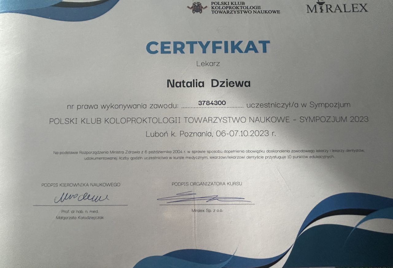Jeśli szukasz młodego, zaangażowanego i wykwalifikowanego proktologa w Warszawie, który nie tylko posiada wiedzę medyczną, ale również rozumie potrzeby pacjenta – lek. Natalia Dziewa będzie odpowiednim wyborem.