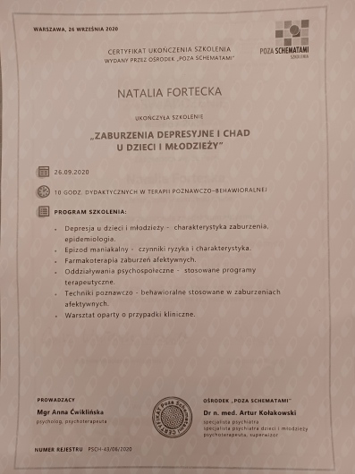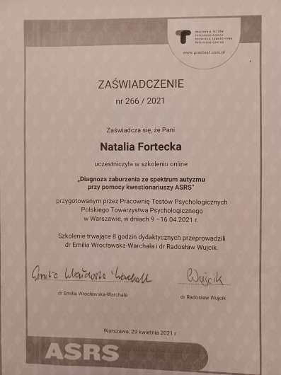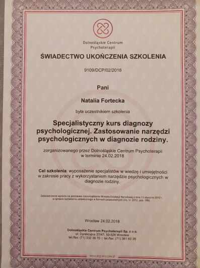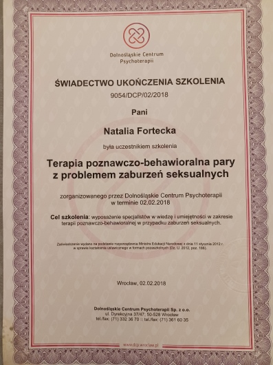 - Specjalistyczny kurs diagnozy psychologicznej. Zastosowanie narzędzi psychologicznych w diagnozie rodziny, - Specjalistyczny kurs diagnozy psychologicznej. Diagnoza neuropsychologiczna dzieci i młodzieży, - Terapia poznawczo- behawioralna par z problemem zaburzeń seksualnych,