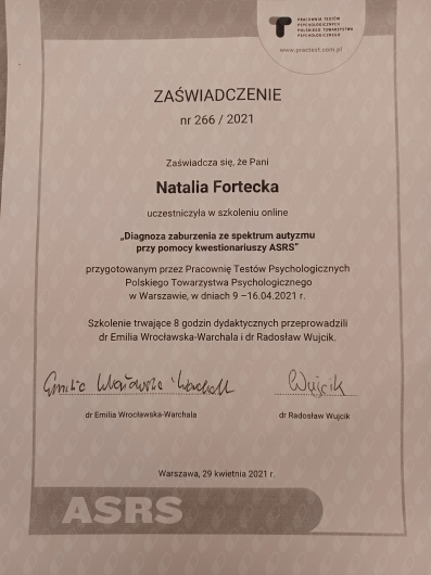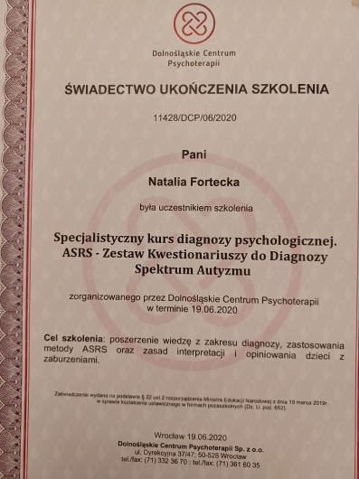 Jaki jest zakres porad oferowanych przez Natalia Fortecka?Natalia Fortecka to psycholog, seksuolog, psychoterapeuta. Na podstawie swojego doświadczenia i wykształcenia Natalia Fortecka oferuje usługi takie jak: poradnictwo psychologiczne, konsultacja seksuologiczna, Psychoterapia dzieci i młodzieży pierwsza wizyta oraz kolejna, Konsultacja psychologiczna, ADOS-2 - diagnoza autyzmu u dzieci, młodzieży i dorosłych, Diagnoza ADHD test diva 5.0, Badanie MMPI-2, Diagnoza ADHD dzieci i młodzieży, konsultacja z zakresu psychologii sądowej, Diagnoza CAPD – zaburzeń centralnego przetwarzania słuchowego.