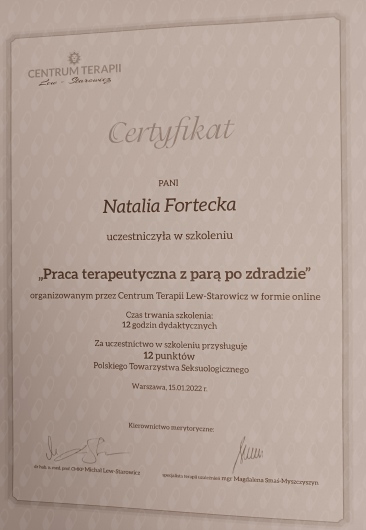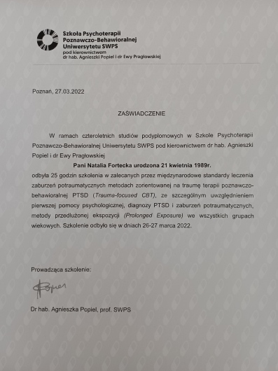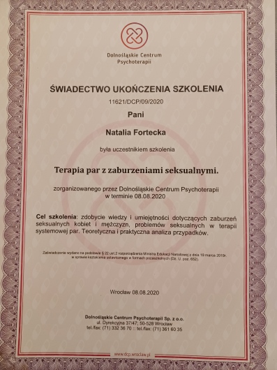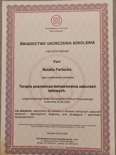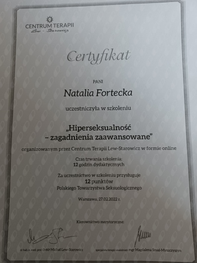 Czy Natalia Fortecka przyjmuje online, bez konieczności pojawiania się w placówce?Tak, Natalia Fortecka oferuje konsultacje online. Wybierz opcję „konsultacja online” przy umawianiu wizyty, a zobaczysz dostępne terminy.