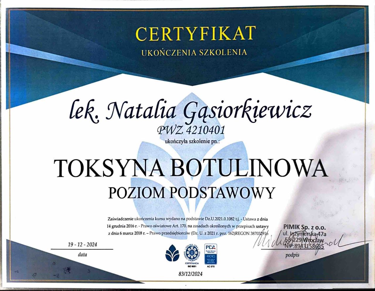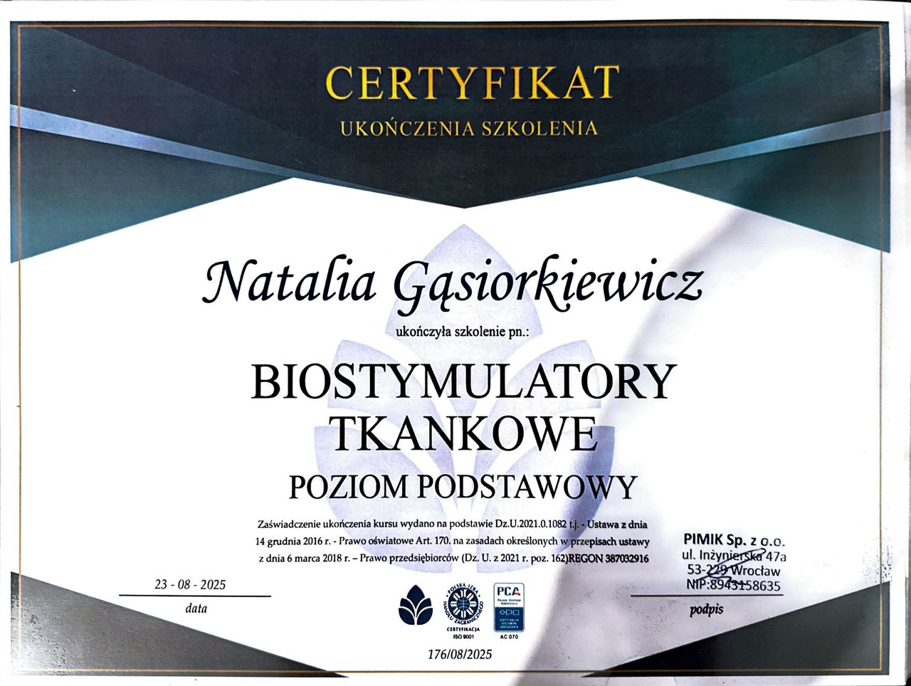 Jaki jest zakres porad oferowanych przez Natalia Gąsiorkiewicz?Natalia Gąsiorkiewicz to lekarz wykonujący zabiegi medycyny estetycznej, stomatolog. Na podstawie swojego doświadczenia i wykształcenia Natalia Gąsiorkiewicz oferuje usługi takie jak: Konsultacja z zakresu medycyny estetycznej, biostymulatory tkankowe, Dermapen-mikronakłuwanie skóry, Radiofrekwencja mikroigłowa, Botox - toksyna botulinowa.