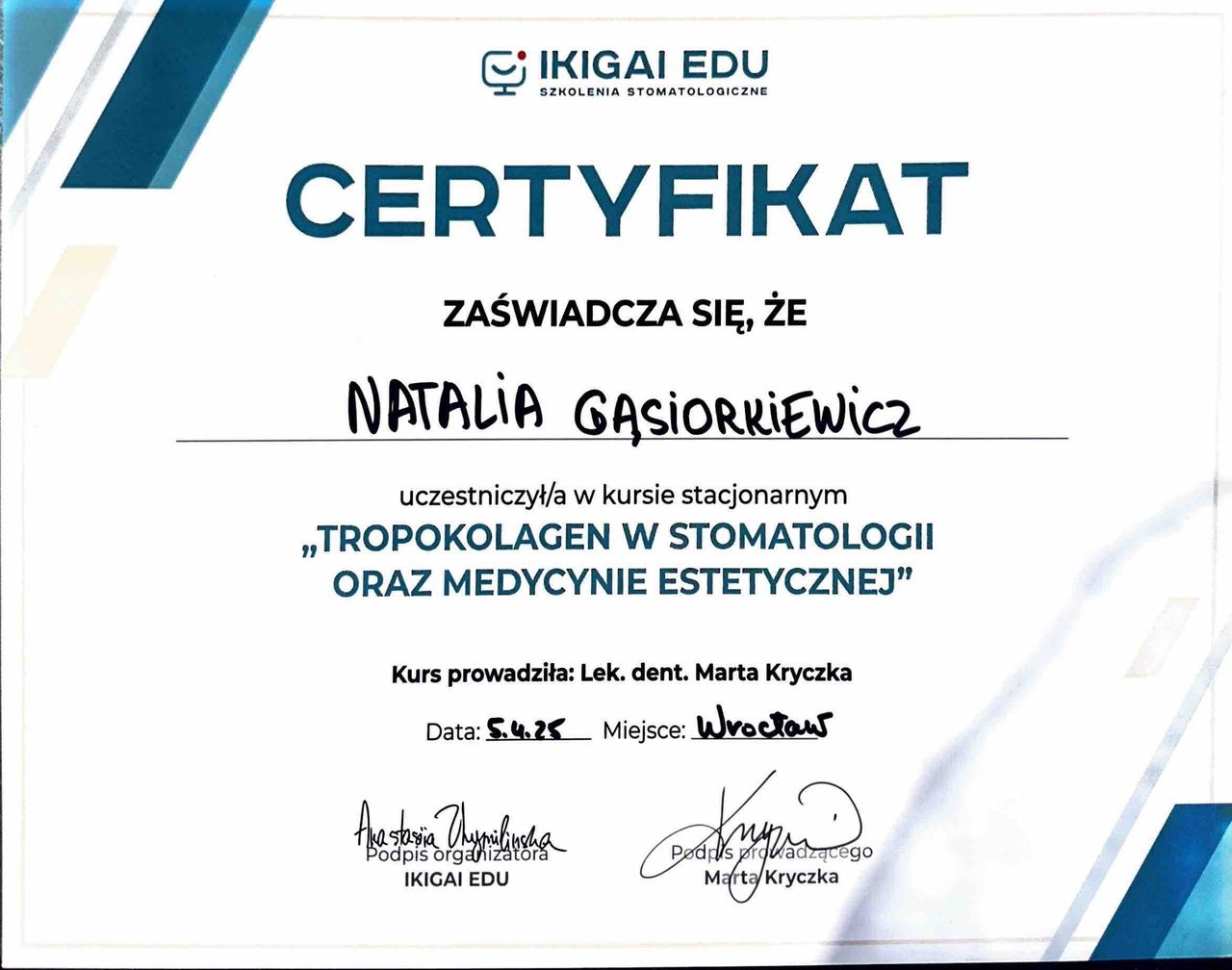 Wraz z ukończeniem studiów lekarsko-dentystycznych na Uniwersytecie Medycznym im. Piastów Śląskich we Wrocławiu postanowiłam rozwijać się również w kierunku Medycyny Estetycznej uczestnicząc w wielu szkoleniach i sympozjach, nieustannie poszerzając swoją wiedzę i umiejętności.
