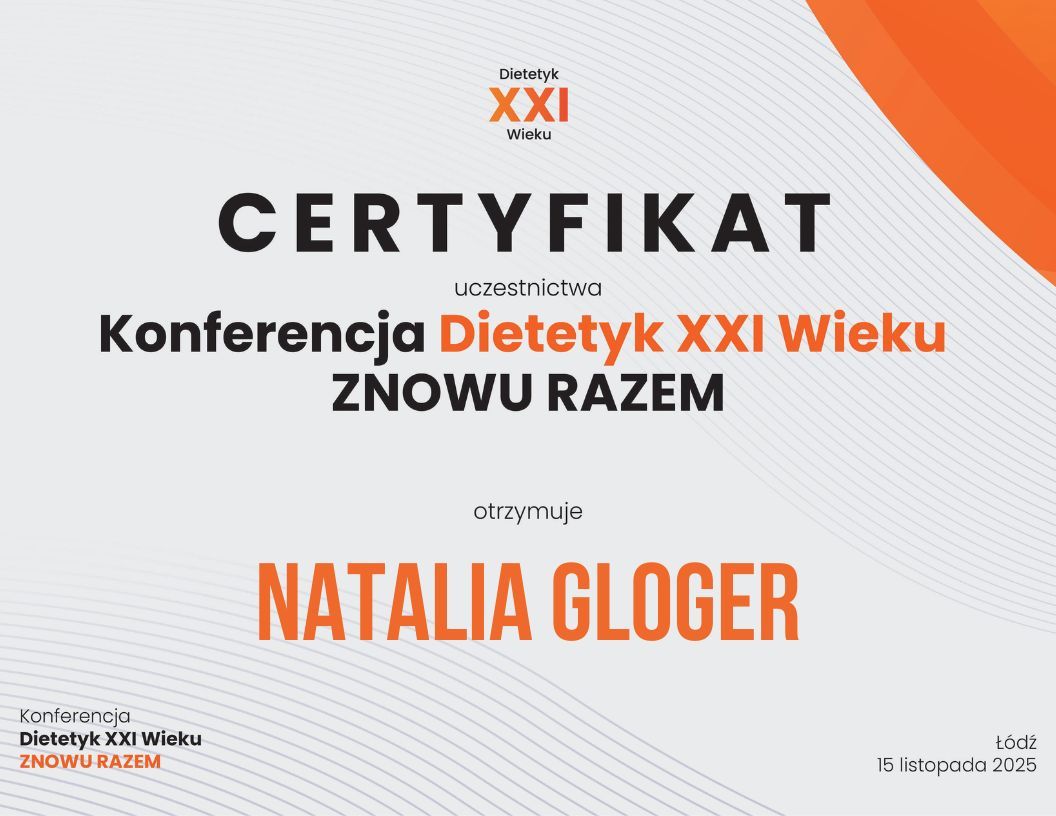Dzień dobry, nazywam się Natalia Gloger i jestem dietetykiem- z wykształcenia ale też z zamiłowania do zdrowego trybu życia. Moje zainteresowanie tematyką odżywiania jest efektem osobistych doświadczeń z nadwagą. Kilkanaście lat temu podjęłam wyzwanie zrzucenia zbędnych kilogramów a dzięki racjonalnemu postępowaniu i zmianie nawyków żywieniowych, efektami swojej pracy cieszę się po dziś dzień. Moją misją jest dzielenie się swoim doświadczeniem i wiedzą z Tobą i z każdym kto chce uzyskać pomoc i wsparcie w osiągnięciu wyznaczonego celu oraz trwałej zmianie nawyków żywieniowych i stylu życia. Do każdego pacjenta podchodzę indywidualnie, mając na uwadze jego stan zdrowia, preferencje czy rodzaj podejmowanej aktywności zawodowej i fizycznej. W układanych przeze mnie jadłospisach skupiam się przede wszystkim na tym, aby były one smaczne, ciekawe i zróżnicowane a jednocześnie łatwe i szybkie w przygotowaniu. Kieruję się przekonaniem, że zdrowa, racjonalna i odpowiednio zbilansowana dieta zapewnia nam poprawę stanu zdrowia, dobre samopoczucie oraz lepszą wydajność. Wszystko to z kolei prowadzi do polepszenia jakości naszego życia i ogólnego zadowolenia, a przyjemnym efektem ubocznym jest zgrabna i szczupła sylwetka :). Pragnę przekonać Cię do tego, że masz realny wpływ na stan własnego zdrowia i wygląd swojego ciała, a racjonalne odżywianie nie jest ani trudne ani kosztowne, a niesie za sobą ogromne korzyści dla całego organizmu. Jeżeli więc chcesz: - poprawić swój stan zdrowia i ograniczyć stosowanie farmakoterapii, - cieszyć się dobrym samopoczuciem na co dzień, - mieć siłę i energię do działania, być bardziej wydajnym, - zrzucić zbędne kilogramy i czuć się dobrze w swoim ciele, - nauczyć się planować posiłki i dokonywać mądrych wyborów, serdecznie zapraszam Cię na spotkanie ze mną. Omówimy wspólnie Twój dotychczasowy sposób odżywiania, stan zdrowia, ustalimy cel jaki chcesz osiągnąć. Poprowadzę Cię przez całą do niego drogę, będąc wsparciem na każdym etapie. W przypadku braku informacji o odwołaniu zaplanowanej wizyty do g.15 dnia poprzedniego, jest ona w pełni płatna.