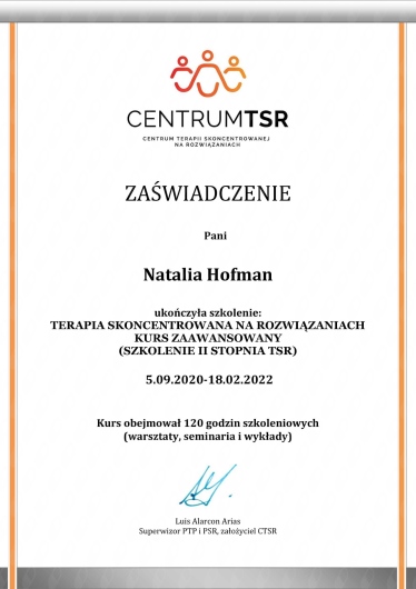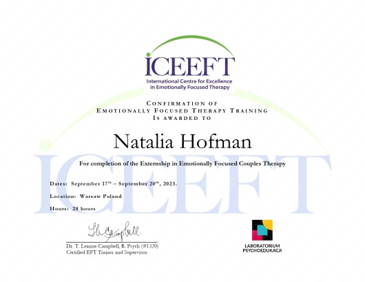W swojej pracy łączę teorię z praktyką – łączę wieloletnie badania z doświadczeniami wyniesionymi z pracy w różnych branżach. Posiadam wykształcenie psychologiczne (mgr psychologii Uniwersytet Łódzki) a także wiele dodatkowych rozszerzających szkoleń m.in. psychoterapeutyczne (Instytut Integralnej Psychoterapii Gestalt 300h), studia podyplomowe z psychologii śledczej na Uniwersytecie SWPS oraz szkolenia z mikroekspresji i analizy z wyglądu (Paul Ekman), szkolenia z psychografologii, analizy z wyglądu, neurobiologii języka w terapii, szkolenia z pracy z traumą somatic experiance (Sabina Sadecka), szkolenia pracy na zasobach dla dorosłych i młodzieży i dzieci (TSR ponad 200h), EFT dla par (Emotionally Focused Therapy) ukończyłam w tym zakresie szkolenie Externship EFT – Emotionally Focused Therapy – w Laboratorium Psychoedukacji w Warszawie. Moją superwizorką jest Katarzyna Moneta – Spyra oraz szkolenia z psychoterapii par w nurcie TSR.