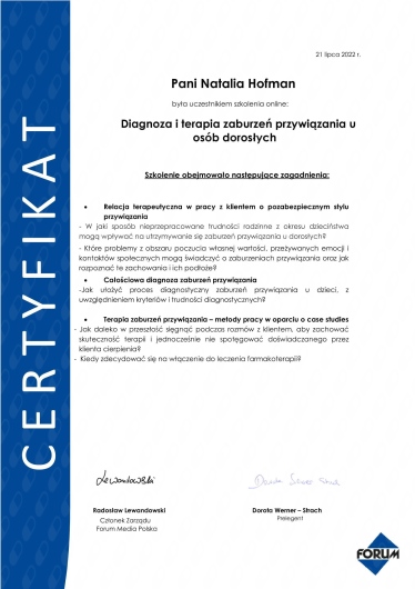 Czy Natalia Hofman przyjmuje online, bez konieczności pojawiania się w placówce?Tak, Natalia Hofman oferuje konsultacje online. Wybierz opcję „konsultacja online” przy umawianiu wizyty, a zobaczysz dostępne terminy.