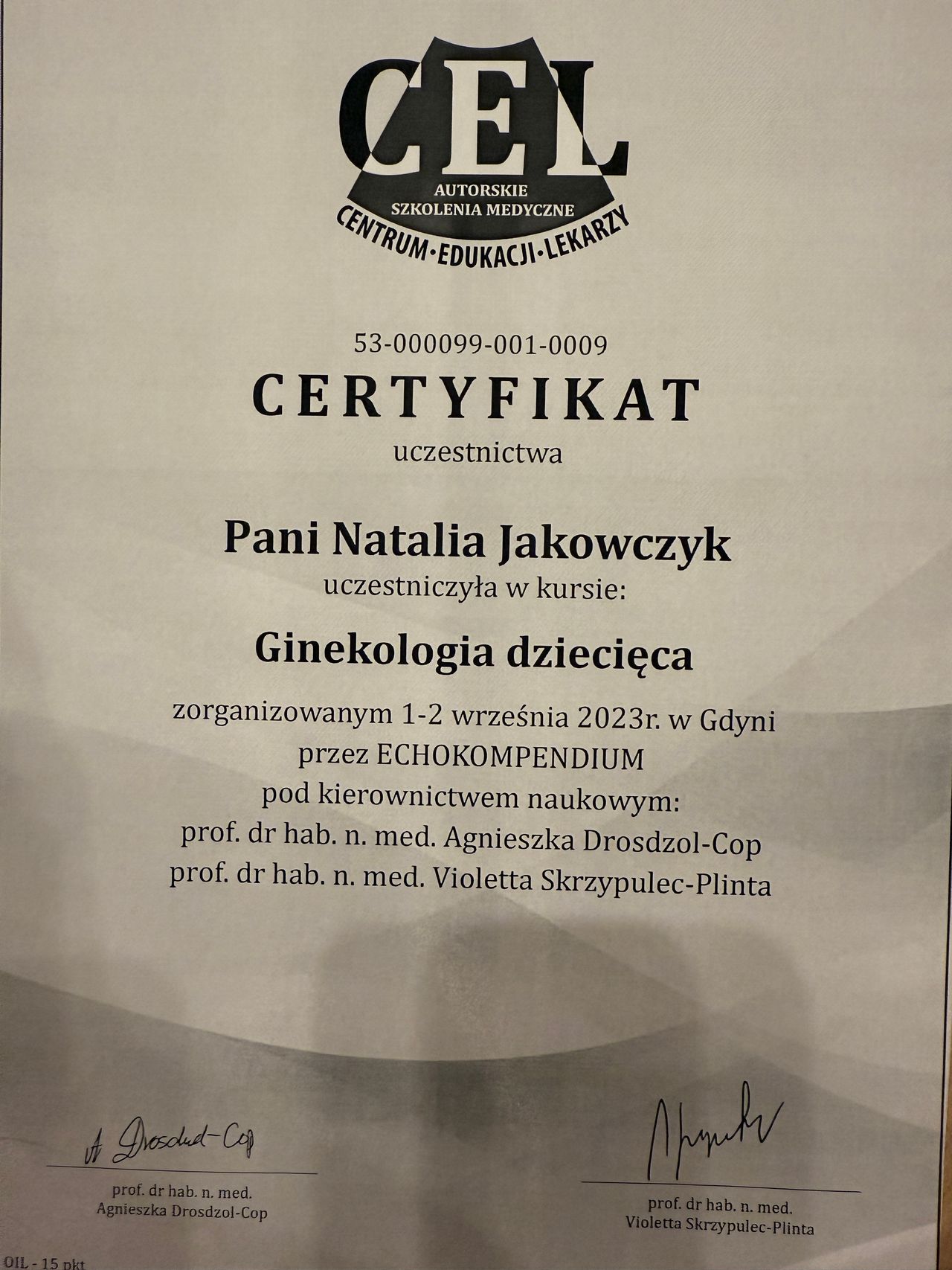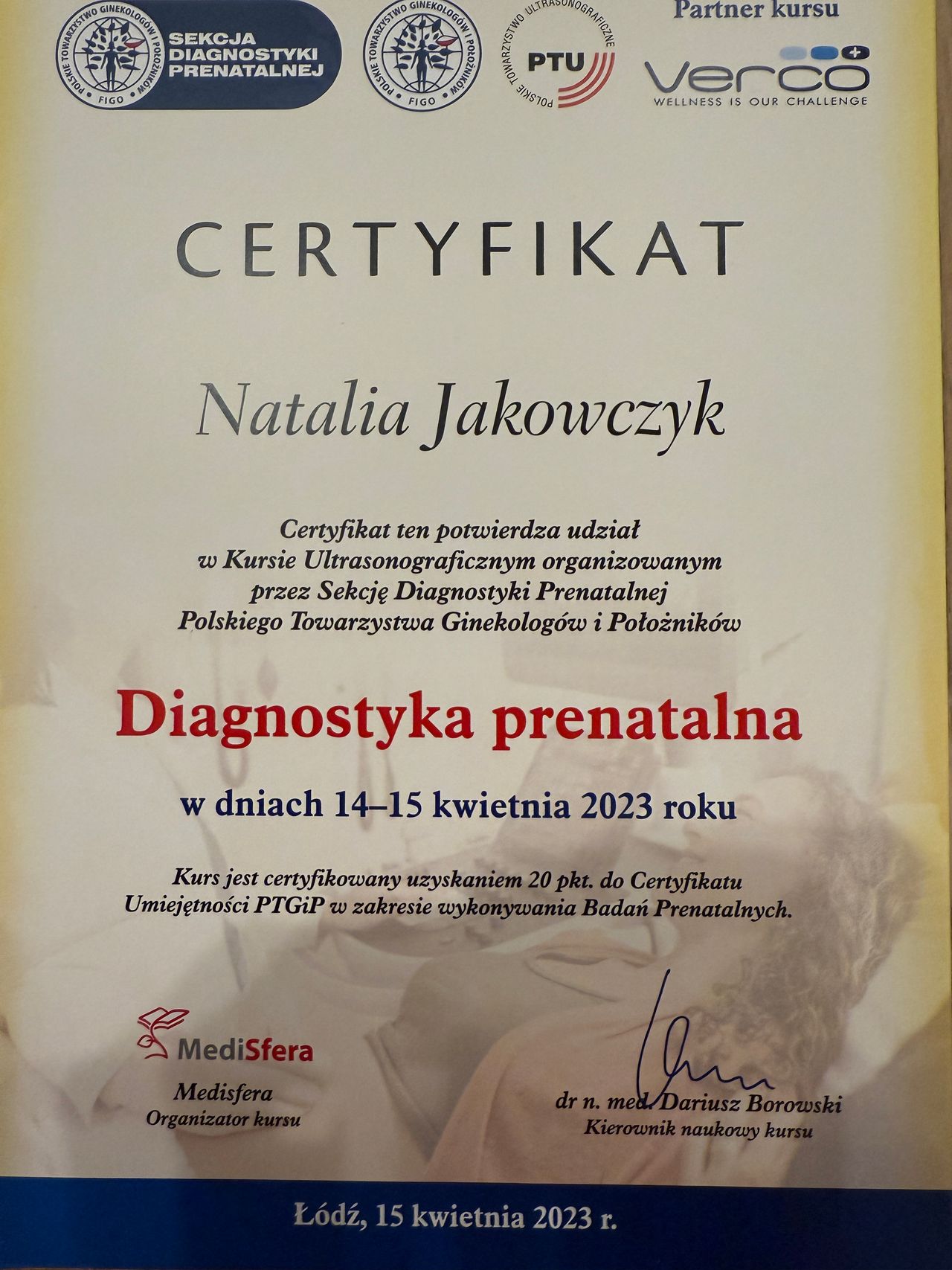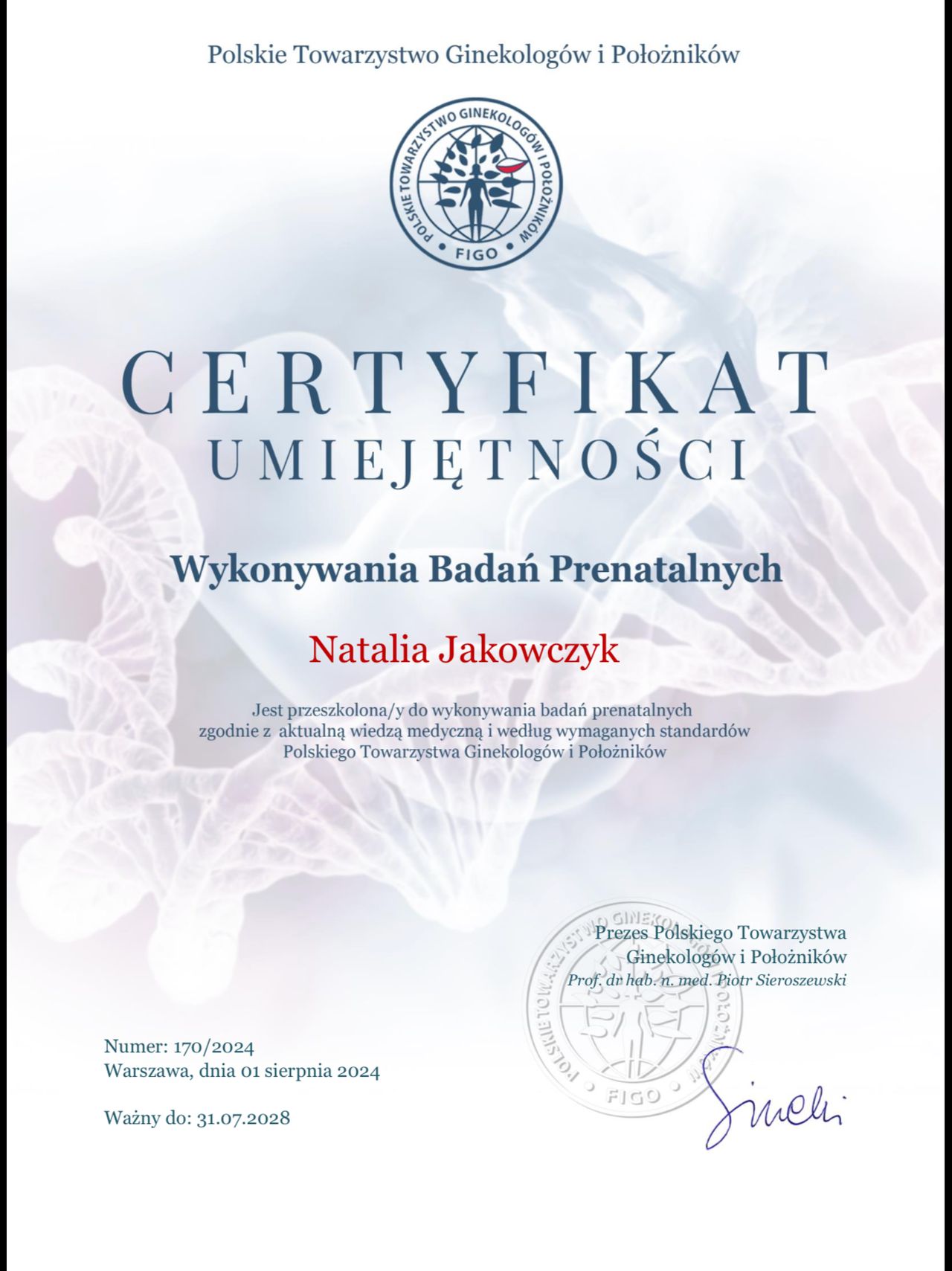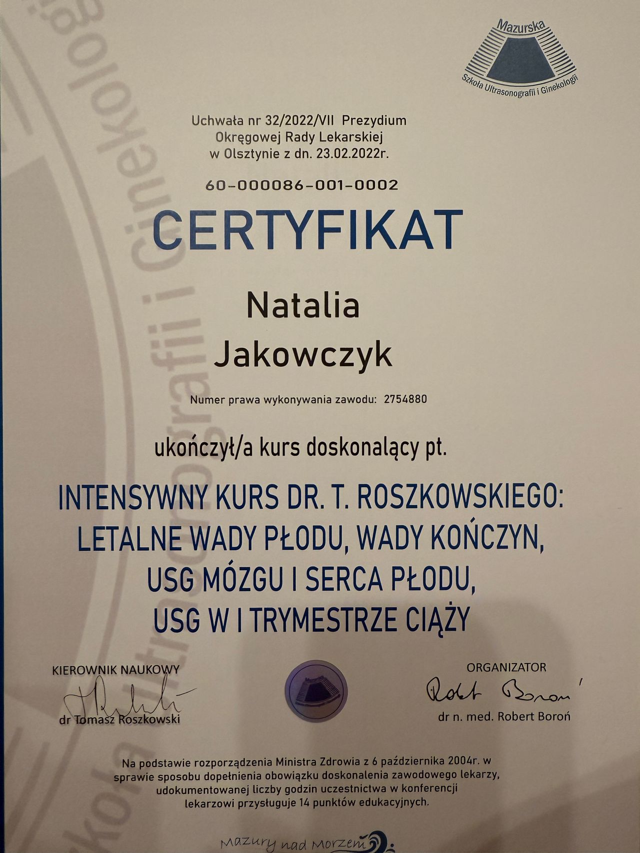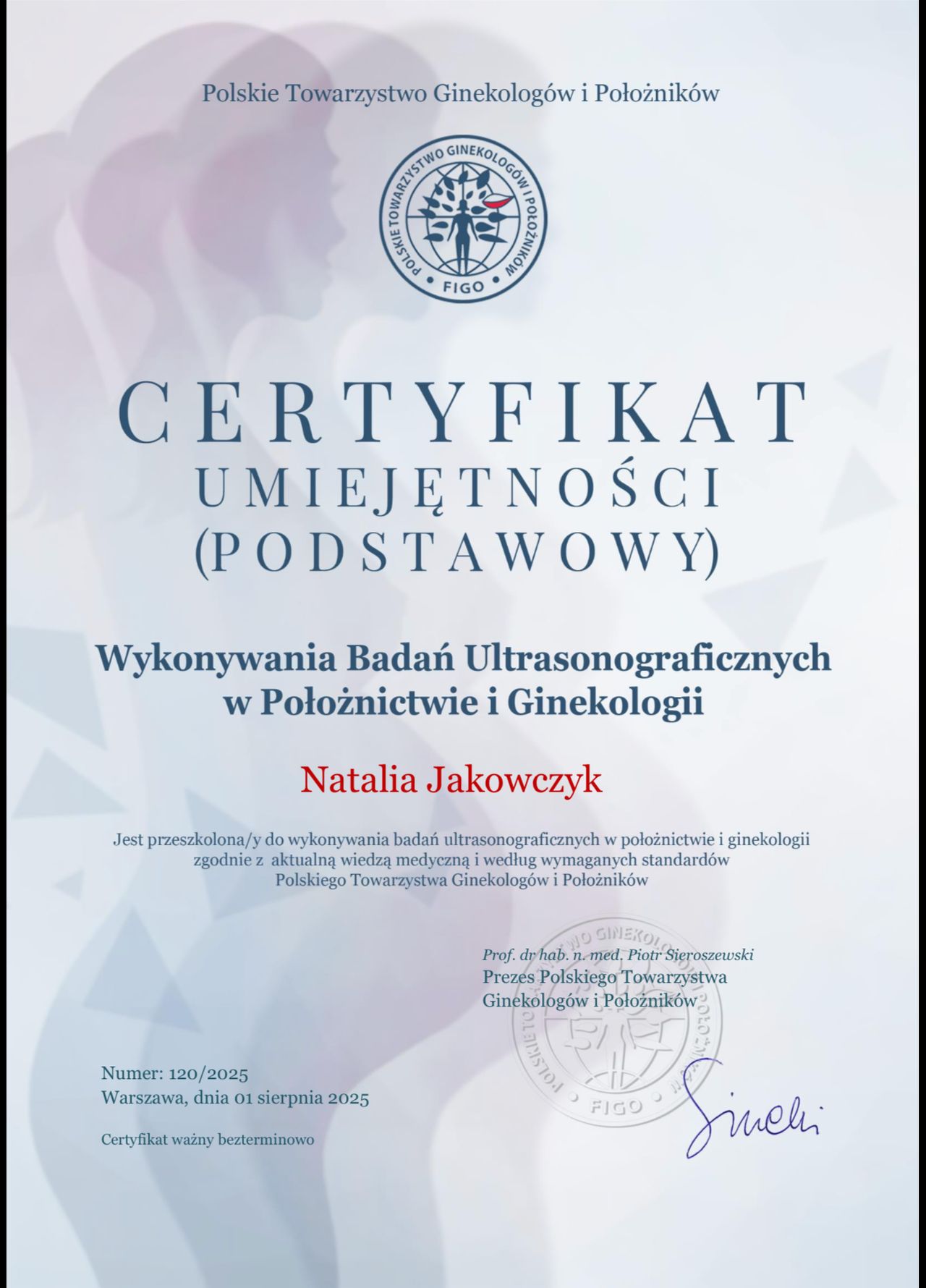 Specjalista ginekologii i położnictwa, w trakcie drugiej specjalizacji z rozrodczości i endokrynologii ginekologicznej w Uniwersyteckim Szpitalu Klinicznym w Białymstoku. Posiada 18 letnie doświadczenie zawodowe. Ukończyła liczne kursy, szkolenia i staże w zakresie m.in. ultrasonografii położniczej i ginekologicznej (posiada certyfikat sekcji USG PTG), diagnostyki i leczenia niepłodności, patologii ciąży, endokrynologii ginekologicznej, histeroskopii i laparoskopii. Prowadzi konsultacje ginekologiczne i położnicze, badania prenatalne, monitoring owulacji, badania drożności jajowodów oraz zajmuje się leczeniem zachowawczym i operacyjnym chorób ginekologicznych. Pomaga kobietom w każdym wieku.