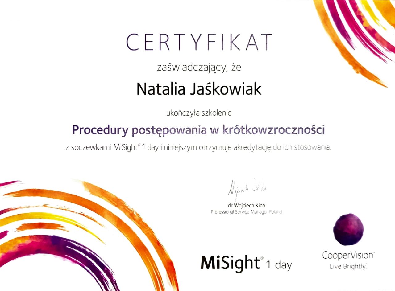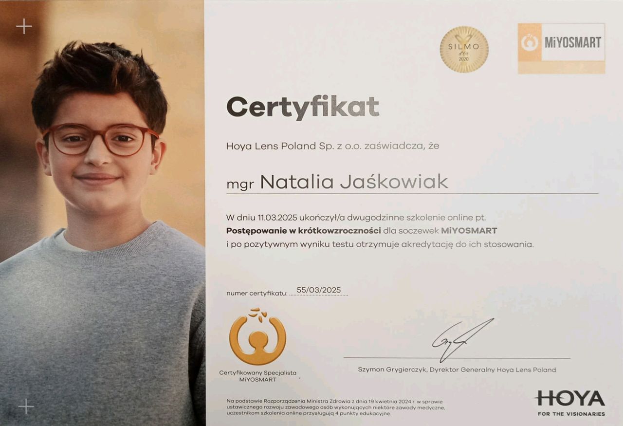 Jestem optometrystką z wykształceniem zdobytym na Uniwersytecie im. Adama Mickiewicza w Poznaniu. Ukończyłam również studia podyplomowe z zakresu rehabilitacji widzenia na Uniwersytecie Medycznym w Poznaniu, co pozwala mi holistycznie podchodzić do potrzeb wzrokowych moich pacjentów. W swojej praktyce wykonuję kompleksowe badania wzroku w zakresie doboru korekcji okularowej oraz dopasowania miękkich soczewek kontaktowych (sferycznych, torycznych, multifokalnych). Zajmuję się również diagnostyką i postępowaniem w zaburzeniach widzenia obuocznego oraz kontrolą progresji krótkowzroczności. Przyjmuję zarówno dorosłych, jak i dzieci od 6. roku życia. Stale podnoszę swoje kwalifikacje, uczestnicząc w licznych kursach i szkoleniach, by zapewniać pacjentom opiekę zgodną z najnowszymi standardami optometrii.
