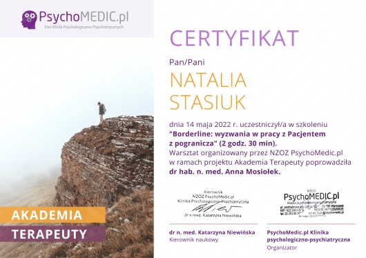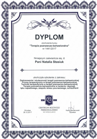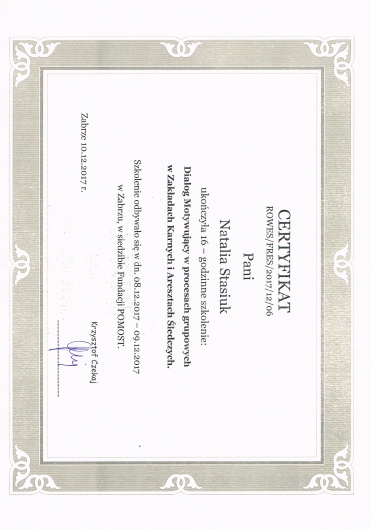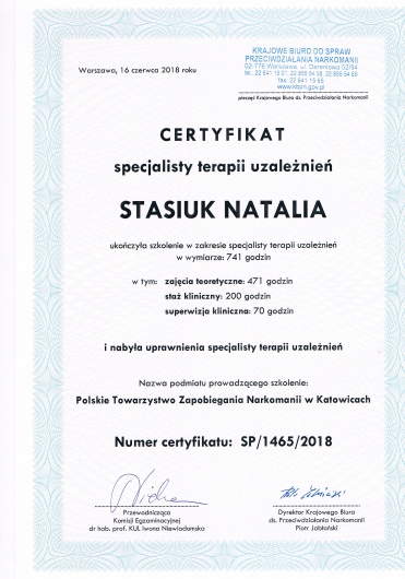 Jestem magistrem pedagogiki resocjalizacyjnej, w takcie 5 letniego kursu psychoterapeutycznego w nurcie systemowo integracyjnym oraz certyfikowanym specjalistą terapii uzależnień (SP/1465/2018).