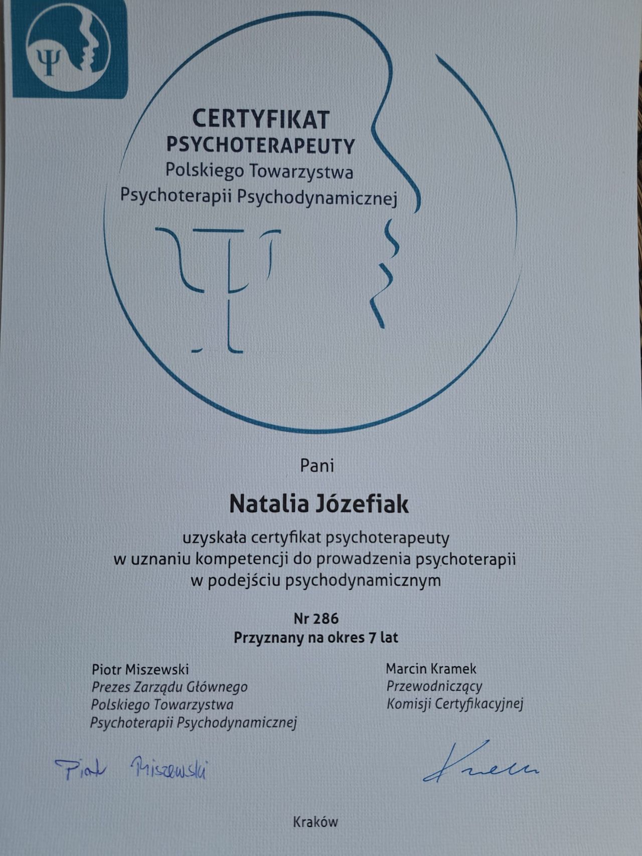 W 2009 roku ukończyłam pięcioletnie studia magisterskie na kierunku psychologia ze specjalnością psychologia kliniczna i zdrowia. Od tego czasu stale podnoszę swoje kwalifikacje zawodowe uczestnicząc w różnego rodzaju studiach podyplomowych, szkoleniach i kursach. Ukończyłam dwuletnie Studium Socjoterapii i Psychoterapii Młodzieży w Krakowskim Centrum Psychodynamicznym. Tam też, w ramach Szkoły Psychoterapii, zdobyłam dyplom psychoterapeuty psychodynamicznego. Ukończyłam dwuletnie szkolenie podyplomowe dla psychoterapeutów z Terapii Skoncentrowanej na Przeniesieniu (TFP) - metody leczenia zaburzeń osobowości, opartej o psychoanalityczną teorię Otto Kernberga - upoważniające do podejścia do egzaminu w ISTFP, celem zdobycia międzynarodowego certyfikatu psychoterapeuty TFP. Pełnię funcję Prezesa Pomorskiego Oddziału PTPPd Polskiego Towarzystwa Psychoterapii Psychodynamicznej (kadencja 2024-2027). W 2026 roku uzyskałam certyfikat psychoterapeuty psychodynamicznego w Polskim Towarzystwie Psychoterapii Psychodynamicznej.