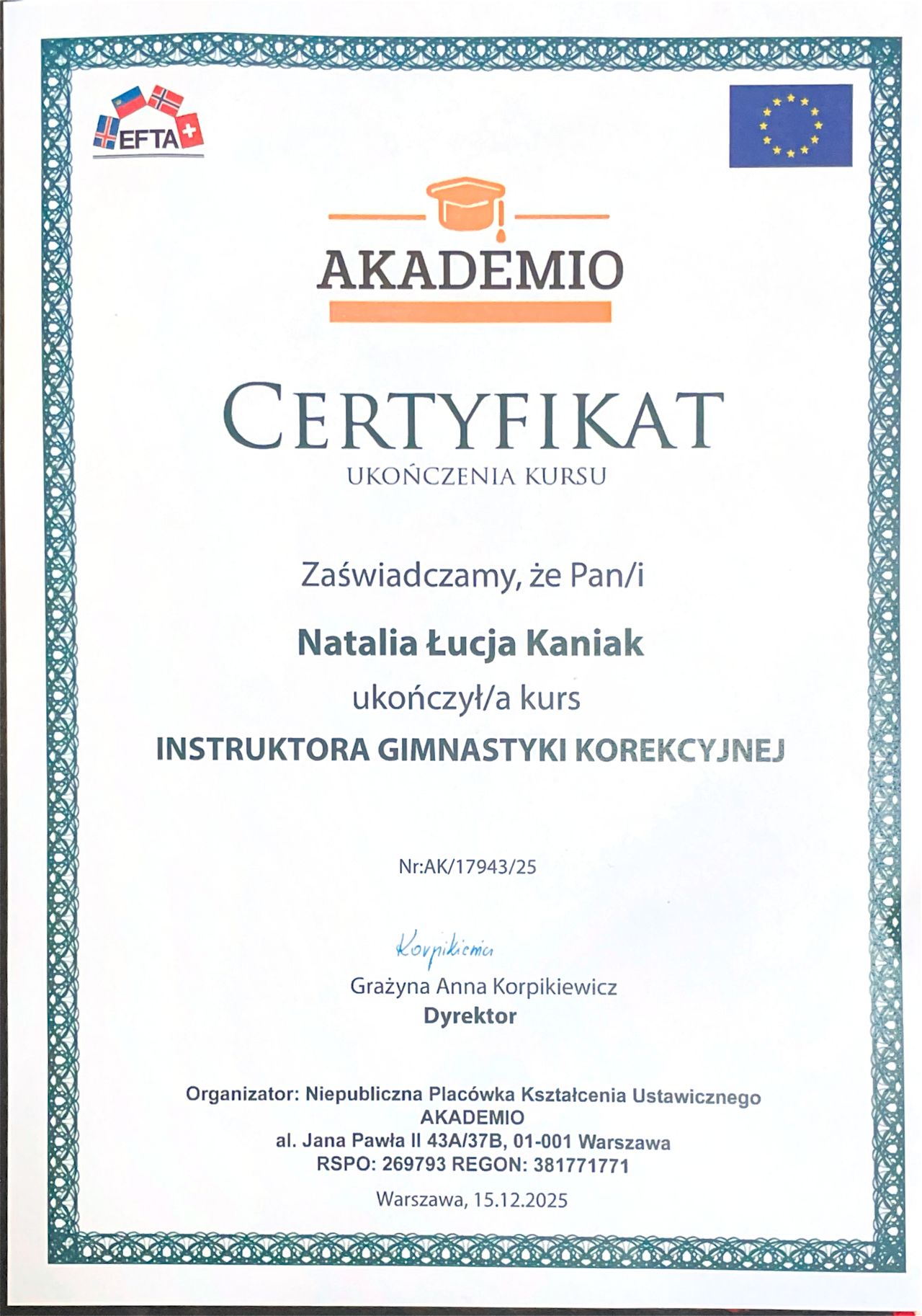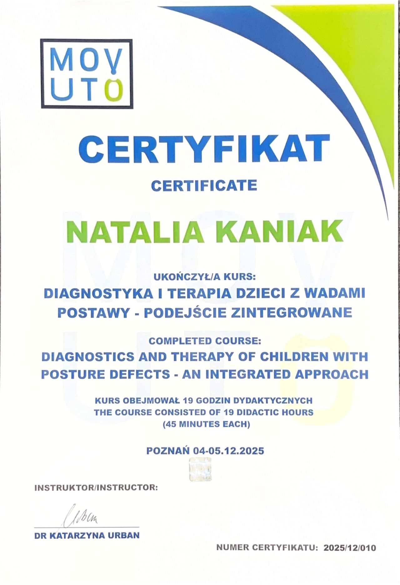 Jestem fizjoterapeutką specjalizującą się w diagnostyce i terapii wad postawy u dzieci oraz młodzieży. Moja ścieżka zawodowa od początku związana jest z pediatrią - doświadczenie zdobywałam pracując z pacjentami na każdym etapie rozwoju, od noworodków po dzieci w wieku szkolnym. To szerokie spojrzenie pozwala mi dziś trafnie diagnozować przyczyny problemów postawy, które często mają swoje źródło we wcześniejszych etapach ruchowych.