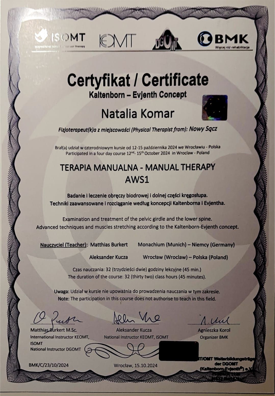 • Terapia manualna wg. koncepcji Kaltenborn-Evjenth Kurs 3 Podstawowy: Badanie i leczenie odcinka lędźwiowego kręgosłupa i miednicy (UWS),