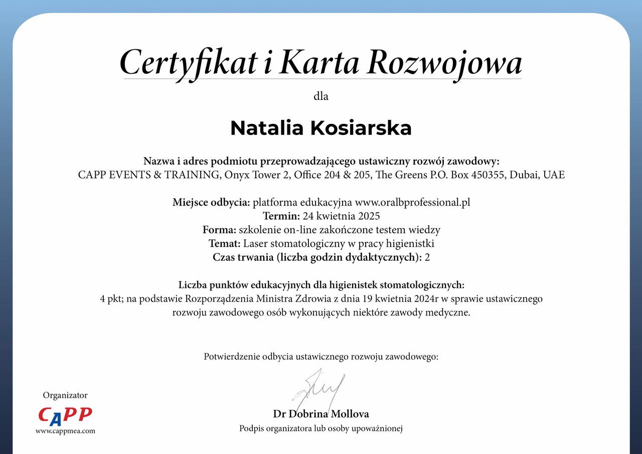 Jaki jest zakres porad oferowanych przez Natalia Kosiarska ?Natalia Kosiarska to higienistka/higienista stomatologiczny. Na podstawie swojego doświadczenia i wykształcenia Natalia Kosiarska oferuje usługi takie jak: higienizacja, piaskowanie, usuwanie kamienia nazębnego.