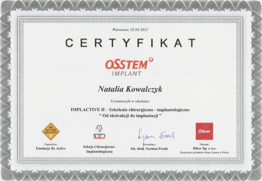 Jedna z dwóch osób w Warszawie, która podjęła się trudnej sytuacji leczenia zaniku dziasel z pokryciem recesji u mnie (druga osoba to znanej klasy prof.). Osoba z poczuciem humoru, dokladna, troszczy się o pacjenta. Miałem bardzo ciężki przypadek leczenia zaniku koło implantu (przeszczep tkanek) i pokrycie gigantycznych recesji dziaseł na zębach obok. Pani Natalia wykonała zabieg przeszczepu. Obecnie wszystko jest w porzadku. Wielu dentystów odradzało przeszczep ze względu na duże prawdopodobieństwo odrzutu i ryzyko pogorszenia sytuacji. Dzięki jednemu dentyście trafiłem na prof. (za co jestem wdzięczny) i finalnie na Pania Natalie. Dziękuję bardzo Pani Doktor.