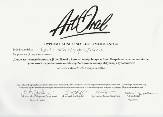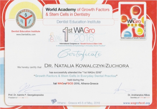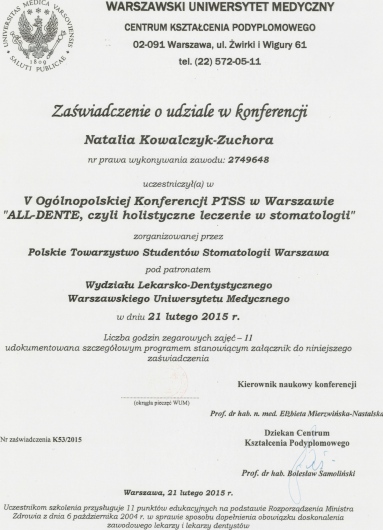 Moi pacjenci zasługują na najwyższy poziom leczenia dlatego uczestniczę w kongresach stomatologicznych w kraju i na świecie oraz licznych kursach i szkoleniach, dzięki którym stale podnoszę swoje umiejętności i poszerzam wiedzę o nowych możliwościach leczniczych.