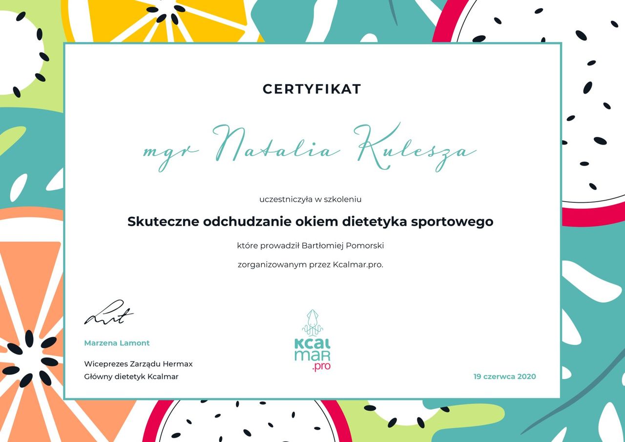 Współpracuje z panią dietetyk online już 3 miesiące. Za każdym razem dostaję dodatkowe materiały, które pomagają mi w utracie masy ciała. Z Panią Natalią pracuje na dzienniczku żywieniowym przez co nie jestem uzależniony od konkretnych przepisów jak w przypadku jadłospisów :) Za mną już 10 kg mniej.