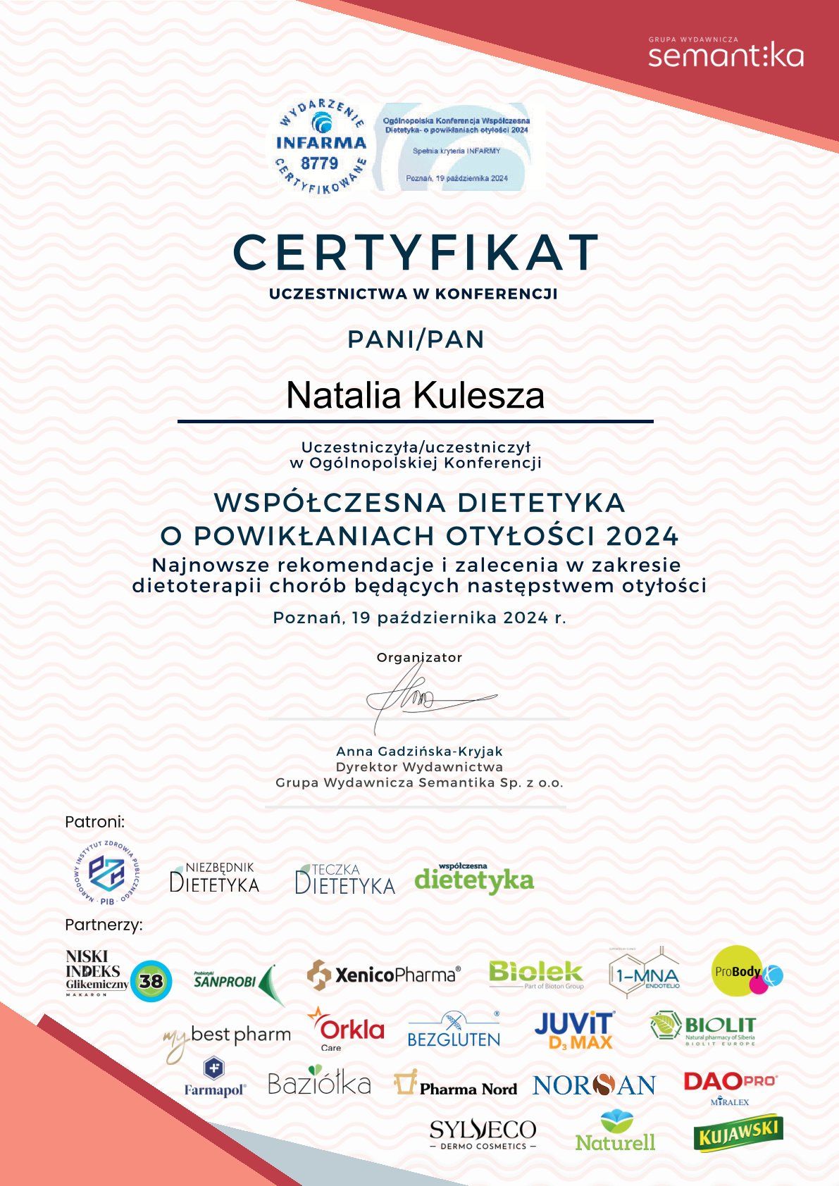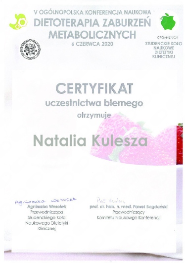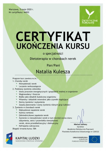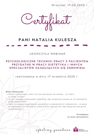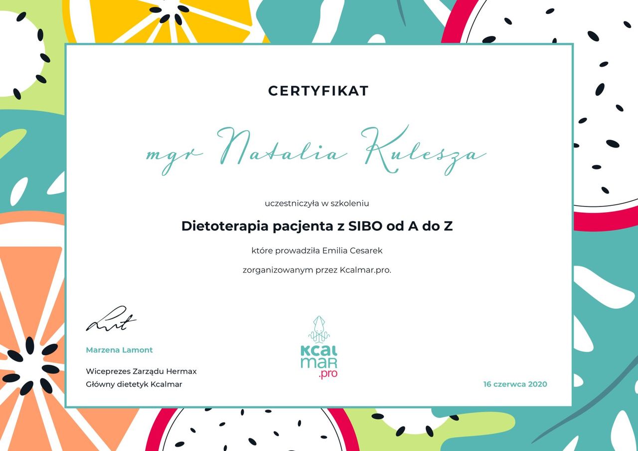 Pani Natalia to świetny pełen zaangażowania specjalista! Bardzo mogę polecić współpracę. Pani Natalia jest bardzo zaangażowana w problem pacjenta. Przepisy, które dostałam były na prawdę bardzo łatwe i wszystko to co lubię, co było dla mnie bardzo istotne. Pani Natalia bardzo mi pomogła w wyjęciu z choroby, z którą trafiłam do gabinetu. Dzięki edukacji prowadzonej podczas wizyt sama już wiem jak komponować posiłki. Bardzo doceniam Panią Natalie.