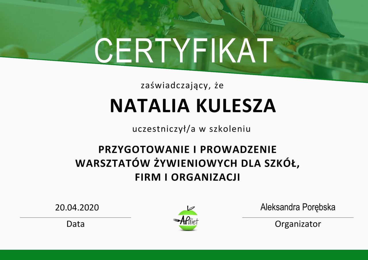 Jaki jest zakres porad oferowanych przez Natalia Kulesza?Natalia Kulesza to dietetyk. Na podstawie swojego doświadczenia i wykształcenia Natalia Kulesza oferuje usługi takie jak: indywidualny plan żywieniowy, Konsultacja dietetyczna (kolejna wizyta), konsultacja dietetyczna (pierwsza wizyta), konsultacja telefoniczna, Konsultacja dietetyczna.
